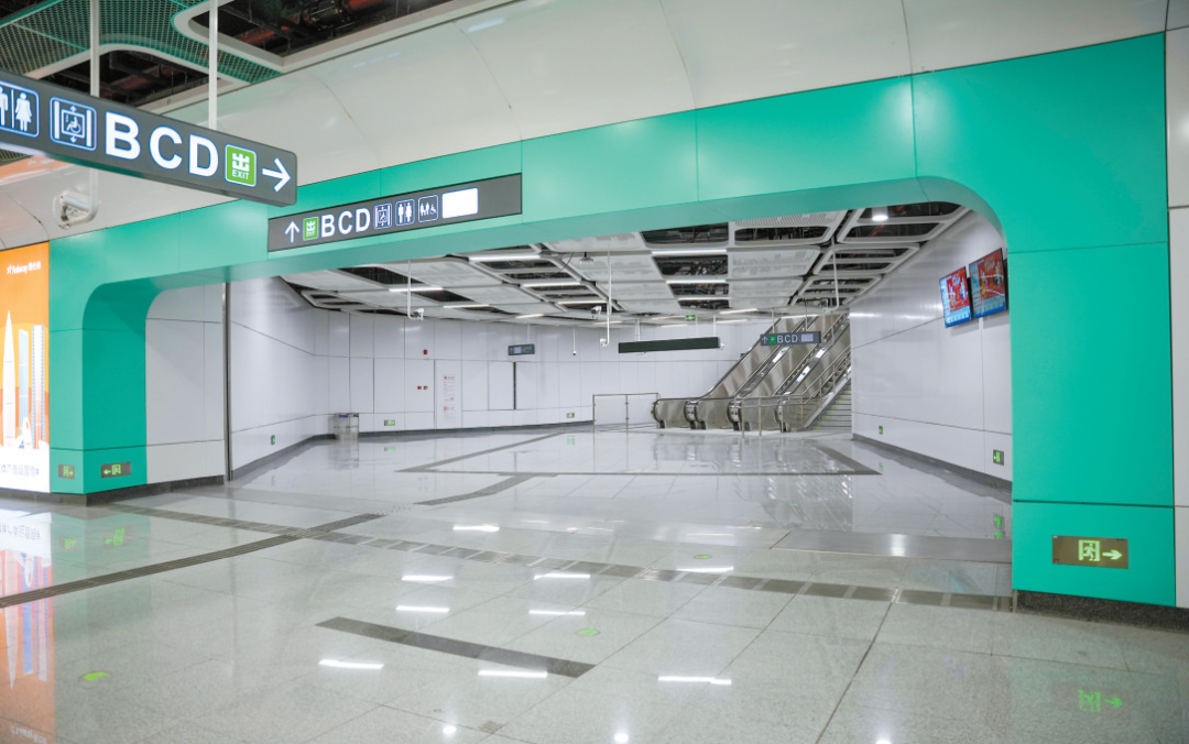 上屋站為標(biāo)準(zhǔn)站,車站以線路科技和生態(tài)特征為切入點進行設(shè)計,采用綠色為分段主題色彩,運用折線空間線條,天花板中的方框造型如城市的窗口,由深圳特色建筑群組成的天際線沖孔圖案有規(guī)律地間隔布置在方框中,象征著地鐵網(wǎng)絡(luò)與城市環(huán)境的融合。