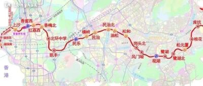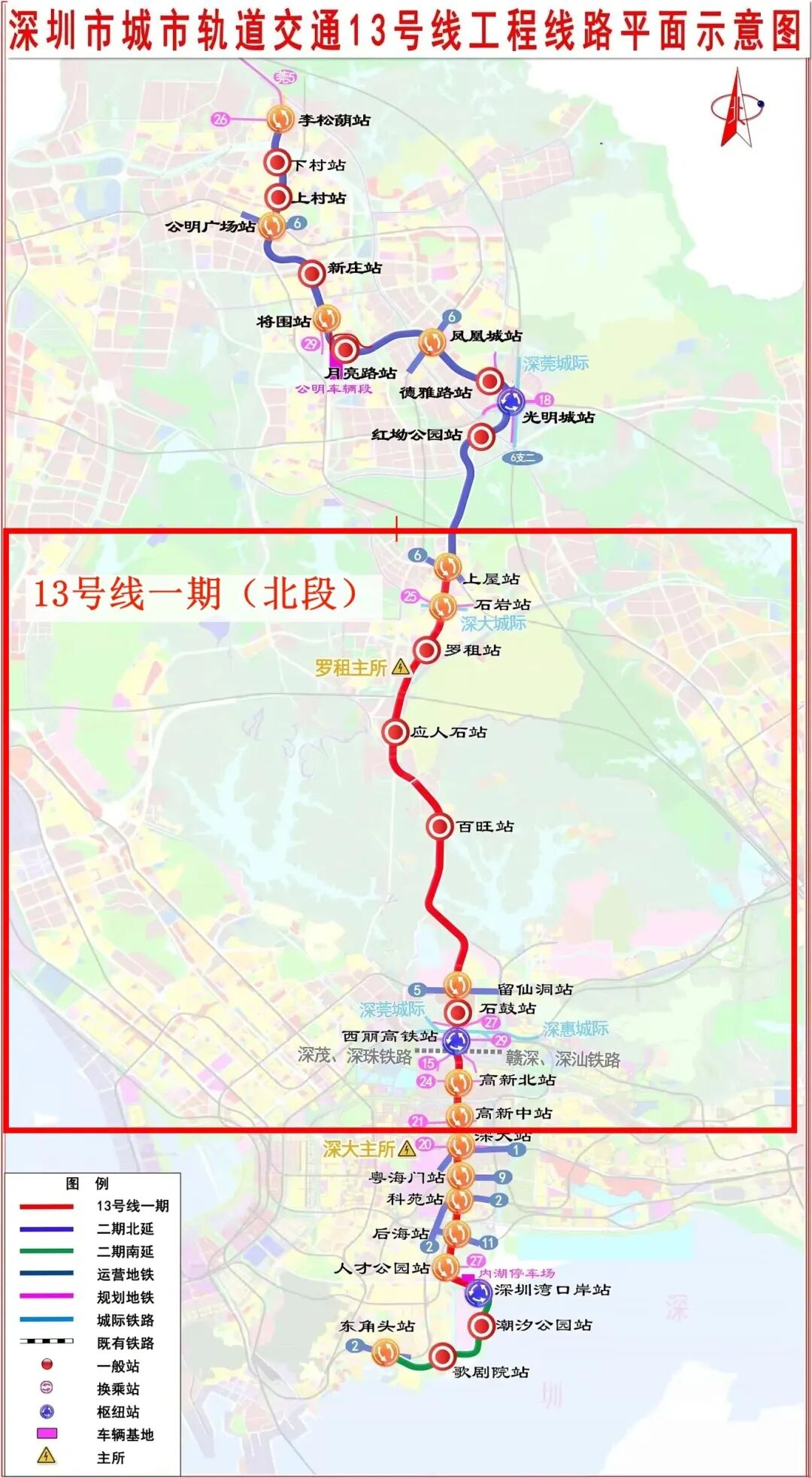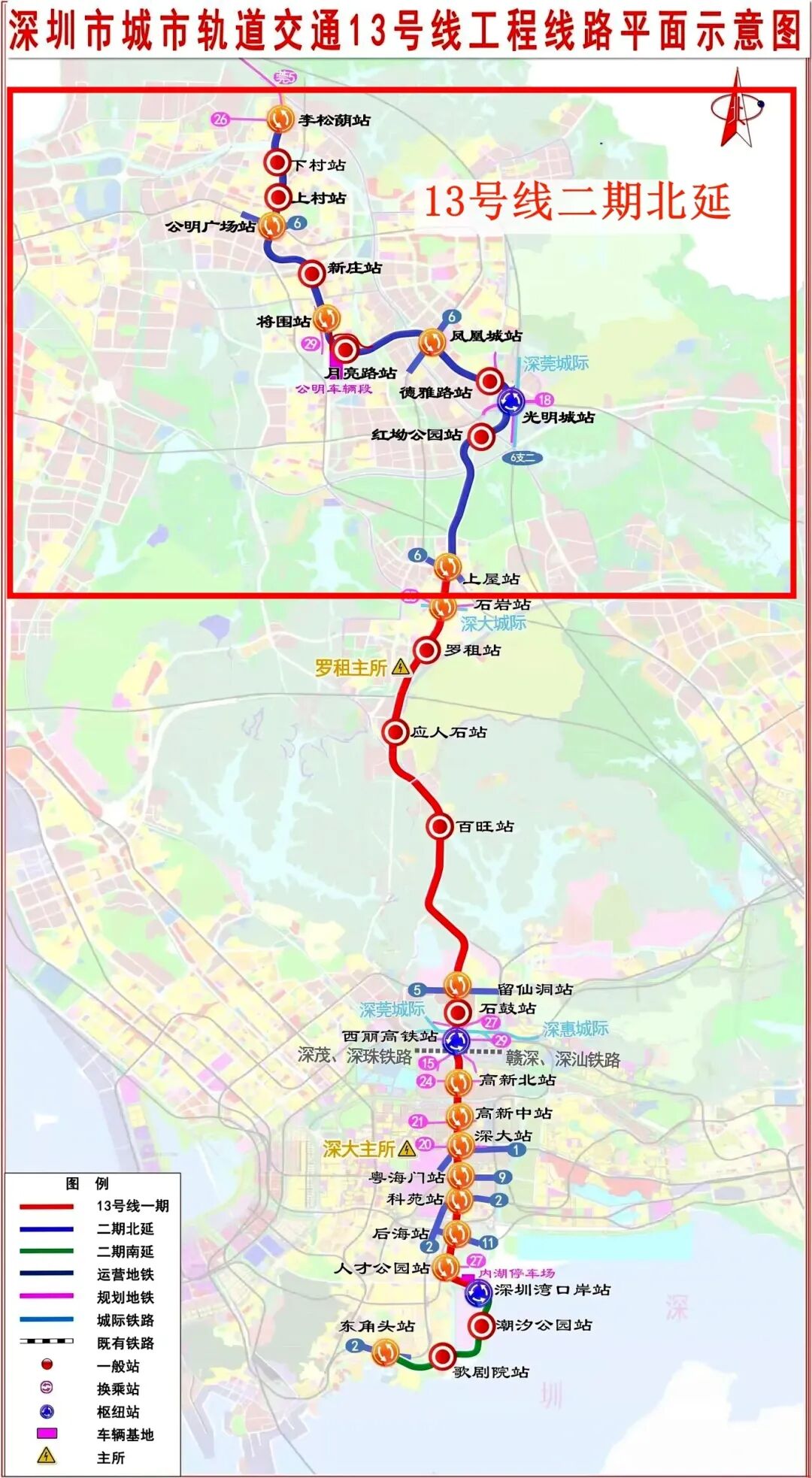 13號線二期北延起于既有上屋站,止于李松蓢站,全長約19.3公里,設(shè)11座車站,并預(yù)留與東莞地鐵銜接條件。