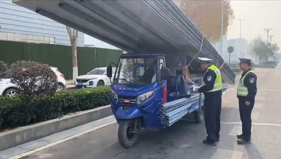 12月10日11時(shí)19分,漯河交警六大隊(duì)民警在轄區(qū)太白山路段執(zhí)勤時(shí),發(fā)現(xiàn)一輛被彩鋼瓦“包圍”的三輪車在路上行駛,長度、寬度、高度均嚴(yán)重超出車身,存在安全隱患,民警見狀立即示意該車駕駛?cè)丝窟呁\囘M(jìn)行檢查。