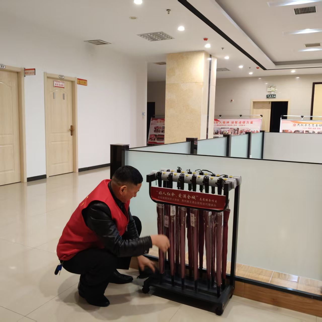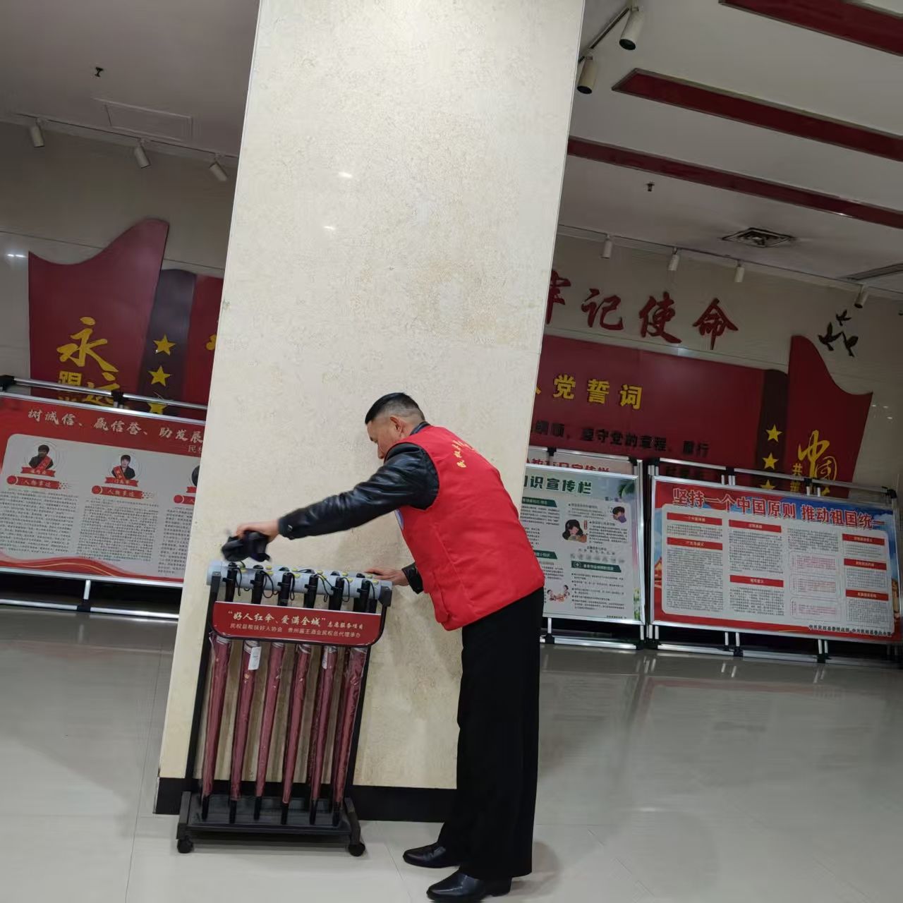 活動中,志愿者對現場擺放的紅傘進行了檢查與整理,對缺失的紅傘進行了補充,并對傘架進行了清潔保養,確保便民設施整潔、完好、可用。