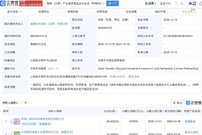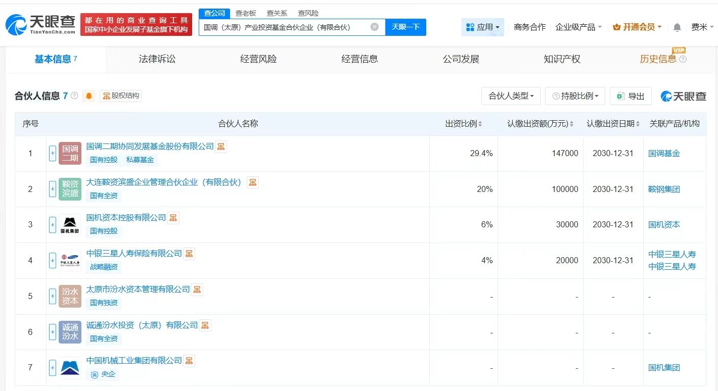 天眼查App顯示,近日,國調(太原)產業投資基金合伙企業(有限合伙)成立,執行事務合伙人為誠通汾水投資(太原)有限公司,出資額50億人民幣,經營范圍為以私募基金從事股權投資、投資管理、資產管理等活動,由國調二期協同發展基金股份有限公司、鞍鋼集團旗下大連鞍資濱盛企業管理合伙企業(有限合伙)、國機資本控股有限公司等共同出資。