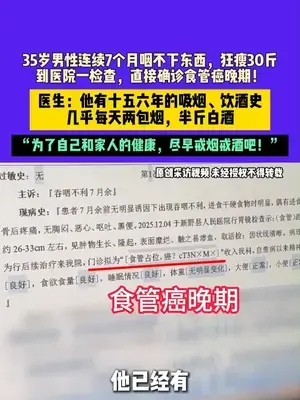 12月19日河南鄭州,35歲男性連續7個月咽不下東西,狂瘦30斤,到醫院一檢查,直接確診食管癌晚期!醫生:他有十五六年的吸煙、飲酒史,幾乎每天兩包煙,半斤白酒,“為了自己和家人的健康,盡早戒煙戒酒吧!”