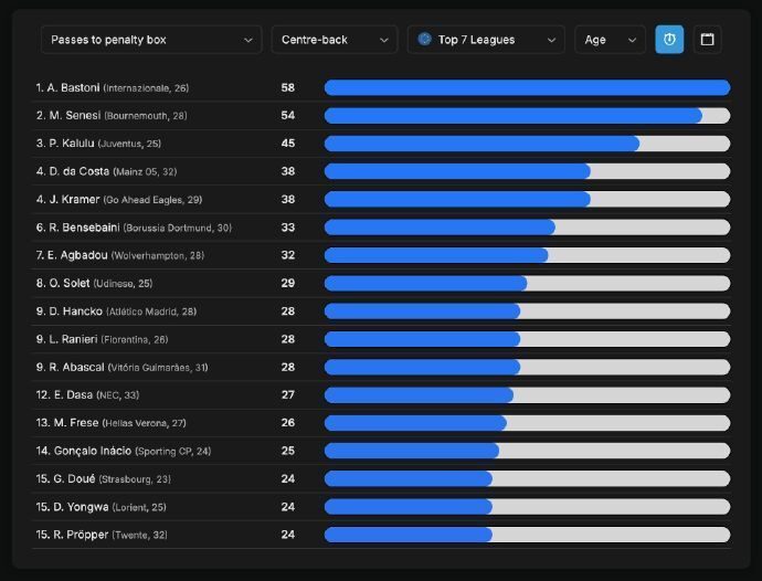 根據(jù)意甲數(shù)據(jù)顯示,巴斯托尼本賽季已經(jīng)63次將球傳入進攻三區(qū),這一數(shù)據(jù)在聯(lián)賽中排名第6,前五位都是像莫德里奇這樣的中前場球員。更令人驚訝的是,他16次將球傳入禁區(qū),排在意甲第4位。在歐冠賽場上,巴斯托尼的這一特質(zhì)更加明顯。他的五個歐冠助攻分別是在對陣門興、巴薩、比爾森勝利、本菲卡和布拉格的比賽中完成的,每一個都價值連城