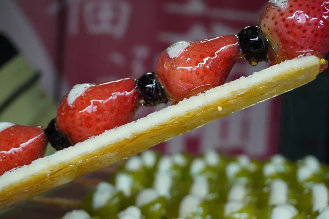 香醇的奶皮和清甜的水果,裹上脆薄的糖衣,大冷天里,咬上一口,幾乎可以中和生活的苦。層出不窮的款式和口味,在全國各地掀起追捧奶皮子糖葫蘆的風潮,有些攤位大排長隊,賣出天價,網絡上催生出無數“奶皮腦袋”。