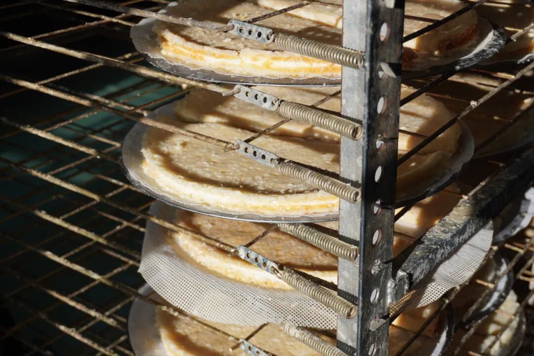 剛出鍋的奶皮,泛著奶黃的顏色被擱在架子上等待晾干,轟隆隆的大風扇加速這個進程。等它們被送到人們的飯桌上,簡簡單單的奶皮子,前途突然廣大了起來。它跳出蒙式早茶的藩籬,跟糖葫蘆、披薩、漢堡、蛋糕一起推動了一種新的飲食風尚。對內蒙古人來說,那是另一個故事了。