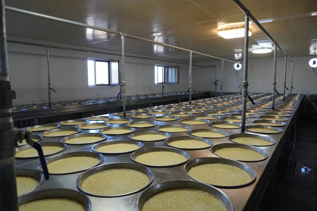 去年,在牧仁和他的兒子巴音那木日一起經營的民心奶食品加工廠里,牧仁和他的家人、工人一起,做出了一張世界上最大的奶皮子。正常大小的奶皮子,大約要花4個小時熬煮晾干成型,而那張9.58平方米的大奶皮用了2000斤牛奶,一共做了4天。這張奶皮讓嘎魯圖的名聲傳到了世界,牧仁的兒子巴音那木日覺得,這是對嘎魯圖最好的品牌宣傳。