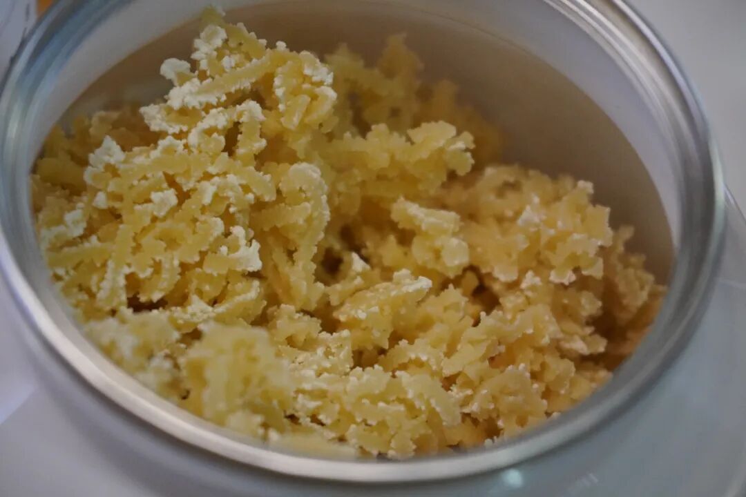 秋天擠下來的高脂牛奶,“稍微放個半天”,上面分離出的一層厚厚脂肪,被內蒙古人稱為“奶嚼口”,實質是酸奶油。發酵的酸奶過濾掉乳清,剩下濃稠的奶酪,擠干之后成型,被稱為“酪蛋子”,也叫“奶渣子”,當地人當零食吃,或者泡茶。