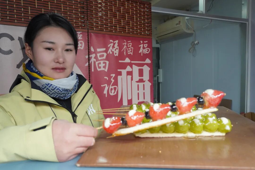 我到店鋪的時候是下午三點左右,賀麗把各種口味的糖葫蘆拿出來展示:普通山楂糖葫蘆底部裹了一整條奶皮子的,在每個山楂里夾小塊奶皮子的,在晴王葡萄、草莓、芭樂、無花果里夾了冷萃酸奶又裹了奶皮子的……款式琳瑯滿目,最重要的是,“每一種都好吃”,都有自己的擁躉。