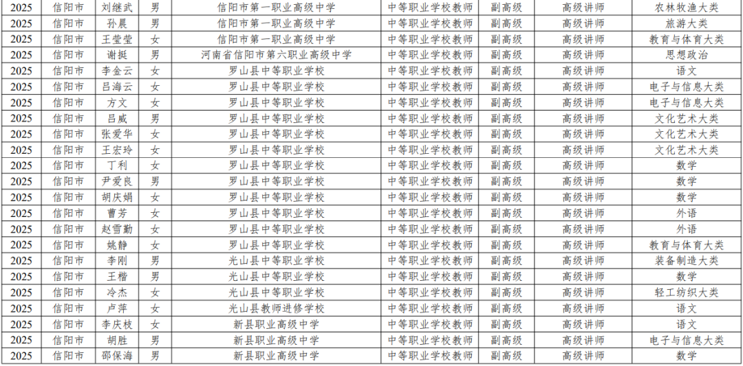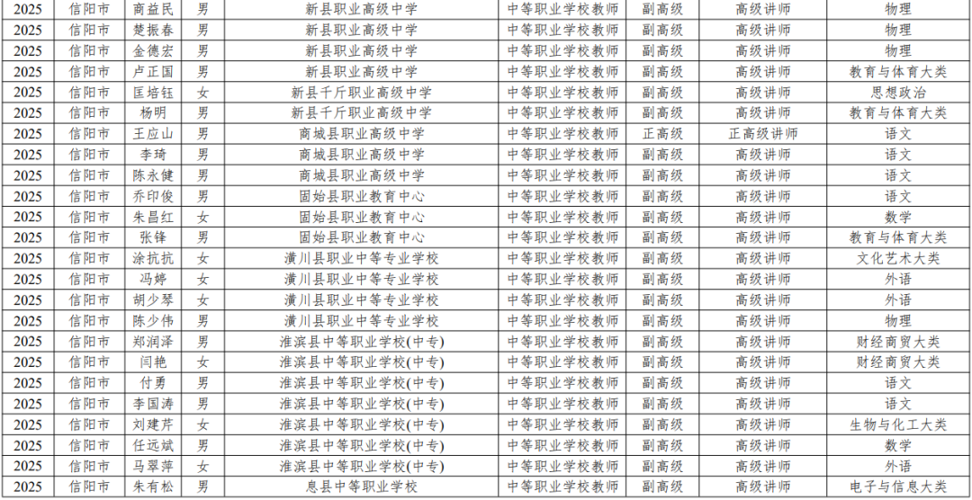 2025年度河南省中等職業學校教師高級職稱評審通過人員名單(信陽)