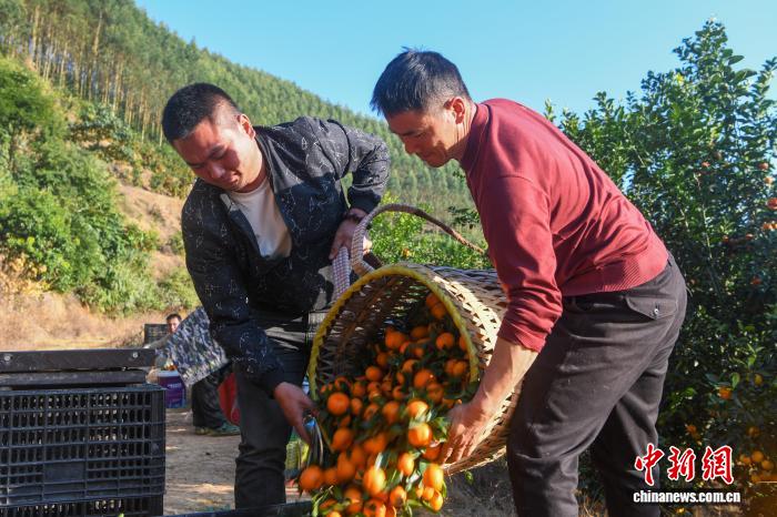 中新網(wǎng)百色12月18日電 (龍家合 趙文朝 黃少鴻)眼下正值沙糖桔成熟上市時(shí)節(jié),走進(jìn)廣西田林縣六隆鎮(zhèn)450畝沙糖桔種植基地,果實(shí)掛滿枝頭,果農(nóng)們穿梭在果樹間,忙著采摘、稱重、分揀、裝箱,一派熱火朝天的豐收景象。