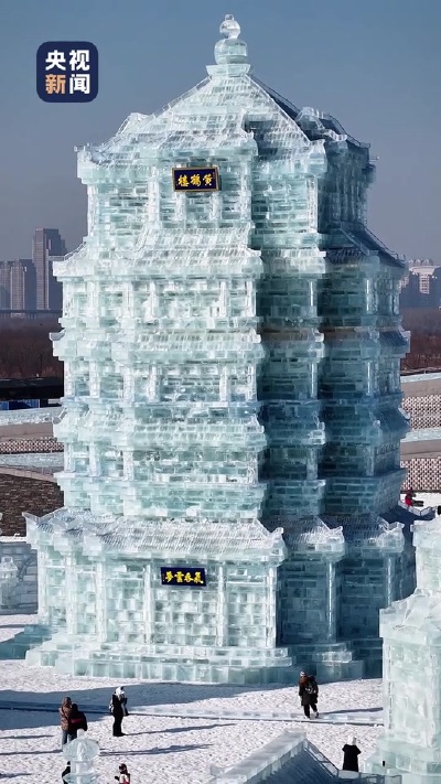 冰雕黃鶴樓亮相哈爾濱冰雪大世界,一起打卡冰雪新地標!(網友:@吳龘龘 )