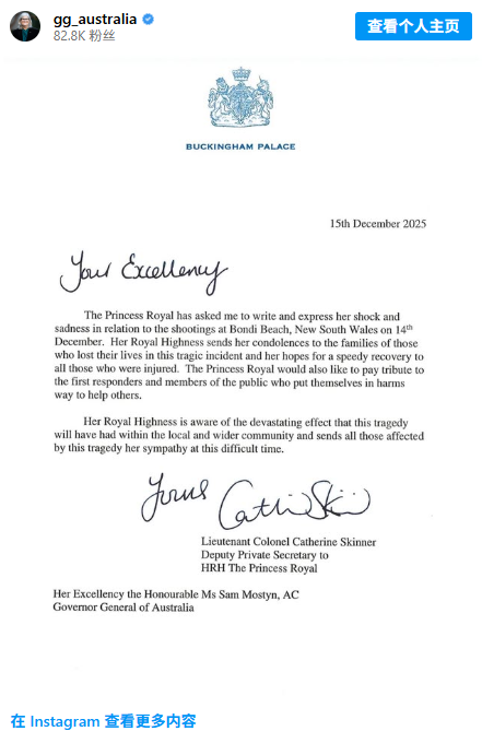“安妮公主殿下已致信表達她對邦迪海灘恐怖襲擊事件的震驚與悲痛。此信緊隨她近期對悉尼的訪問之后發出,”安妮公主的私人秘書、陸軍中校凱瑟琳·斯金納在信中寫道。