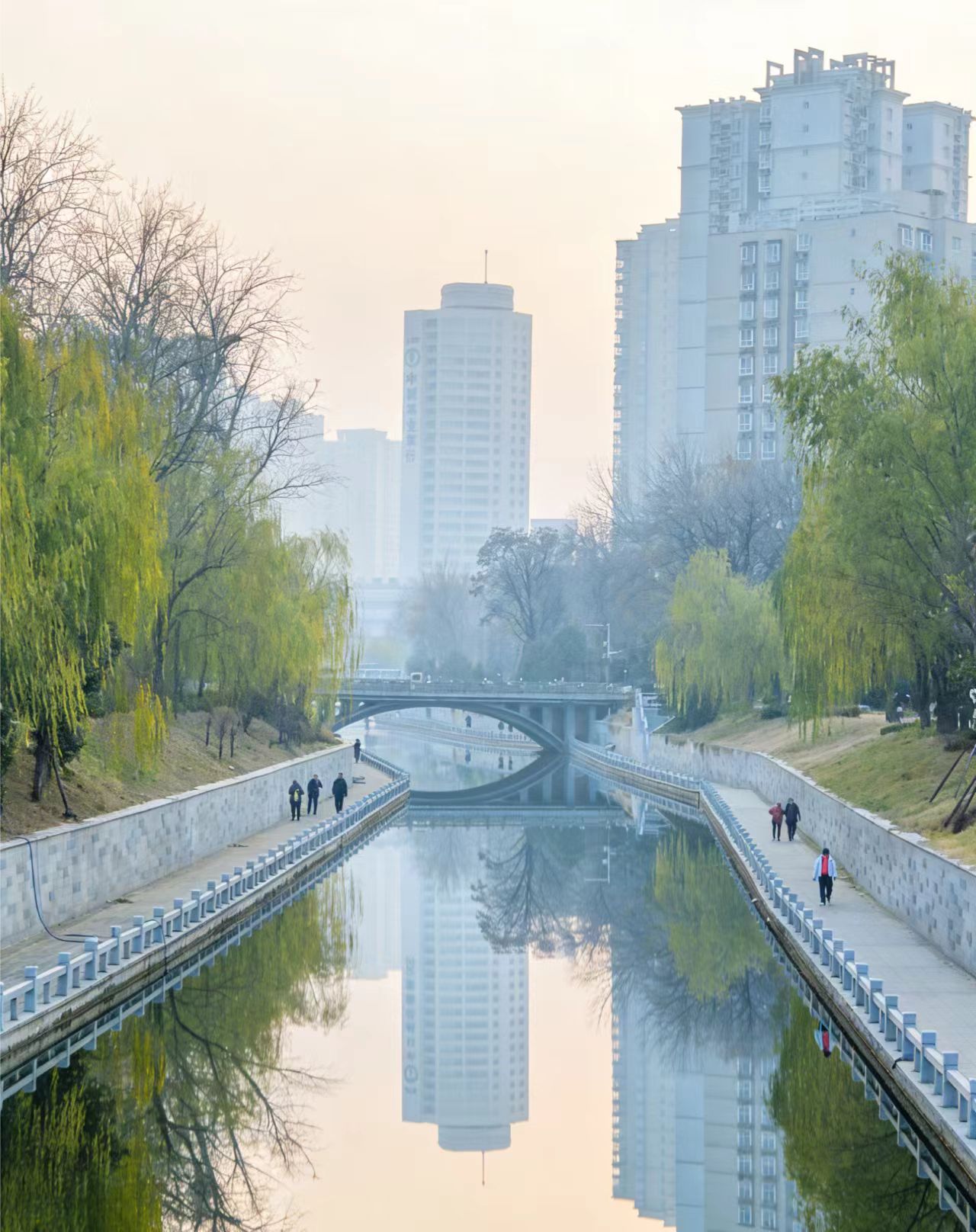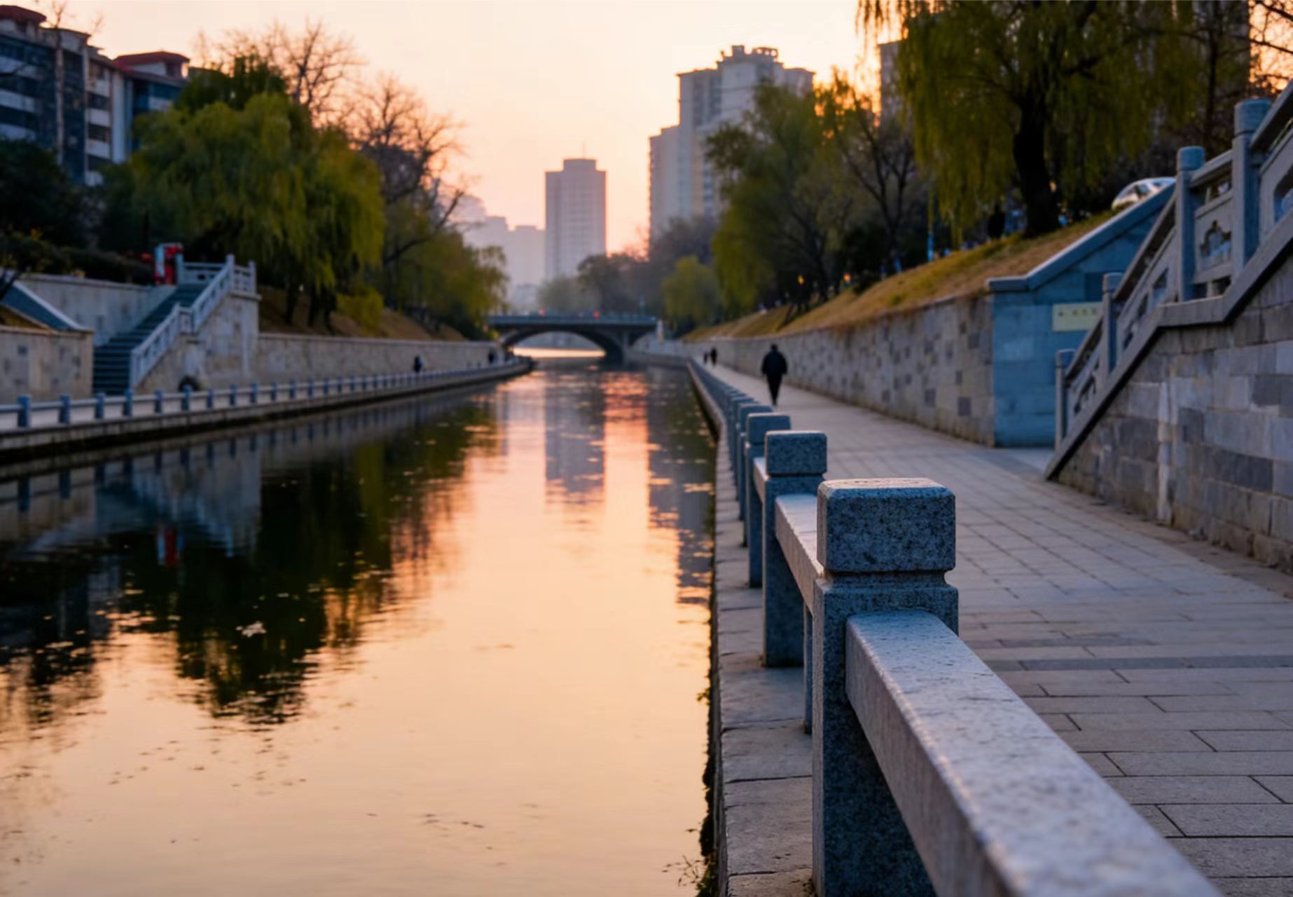 暮色漫過城市肩頭,忙碌了一天的人們,總要去金水河畔走一走。步道旁,楊柳低垂,落日余暉灑在河面上,碎成千萬點金芒;遠處高樓的倒影在水波里輕輕搖晃,現代建筑硬朗與自然景觀的柔美,就這樣完美相融。大爺們聚在一起饒有興致的下棋;孩童嘻笑打鬧著跑過草地;廣場上伴著律動的音樂歡快舞動的人群;晚風里飄來小吃攤的香氣,傳來小商販熱情的叫賣聲;是這個城市煙火氣最真實的寫照。