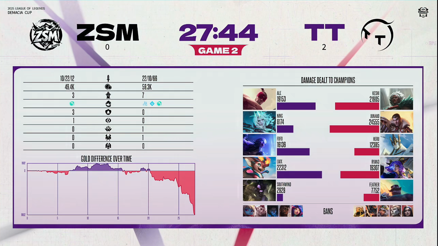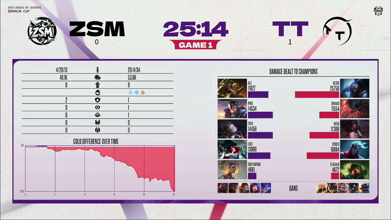 結果TT不講道理,將ZSM打成了單方面的碾壓局。12分鐘左右,Ale鱷魚慘遭Keshi單殺;19分鐘左右,TT下路推進,輕松完成0換3;22分鐘左右,ZSM連續兩次集火擊殺Keshi;最終25分14秒,TT團滅ZSM,贏下一局。