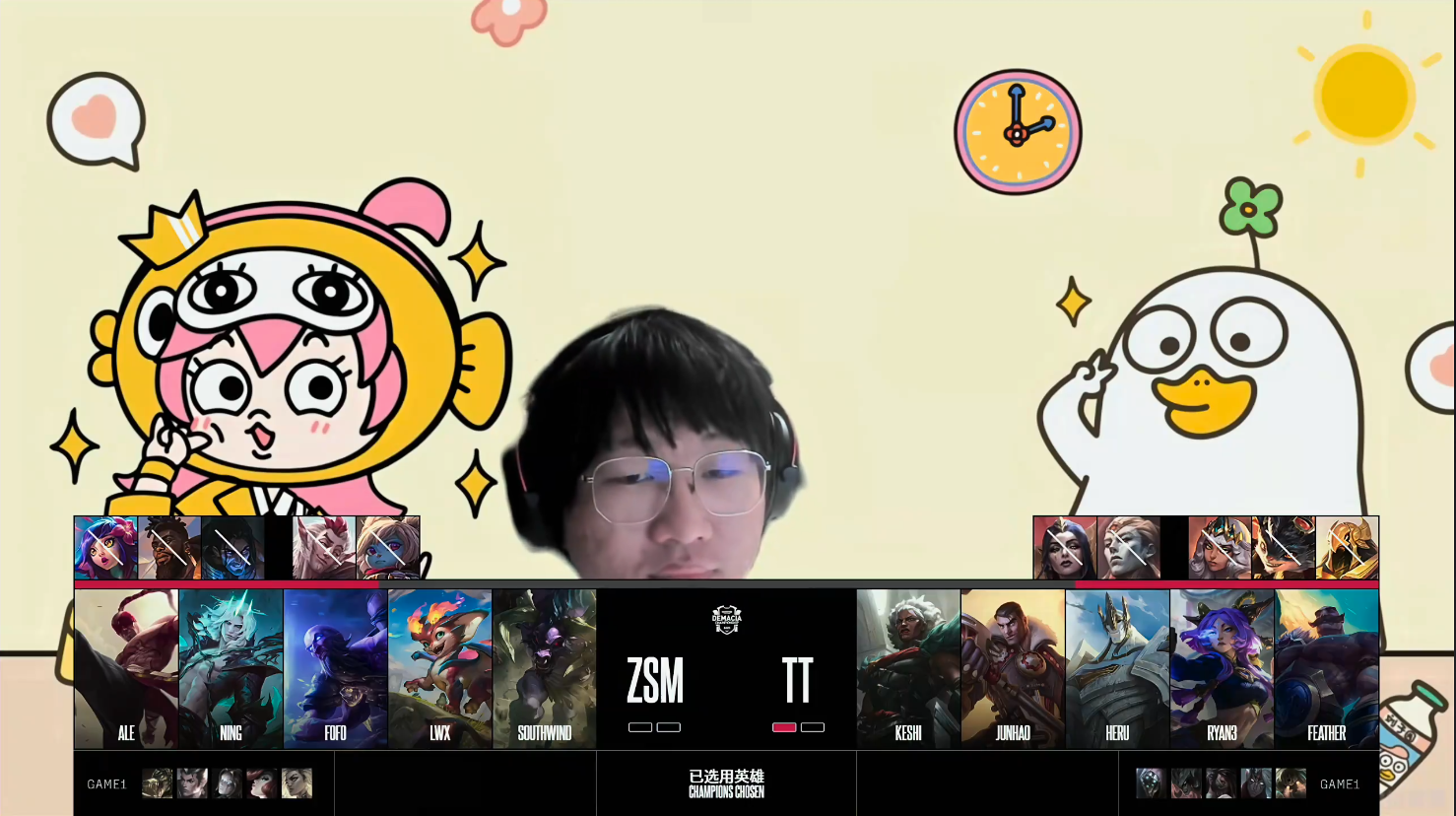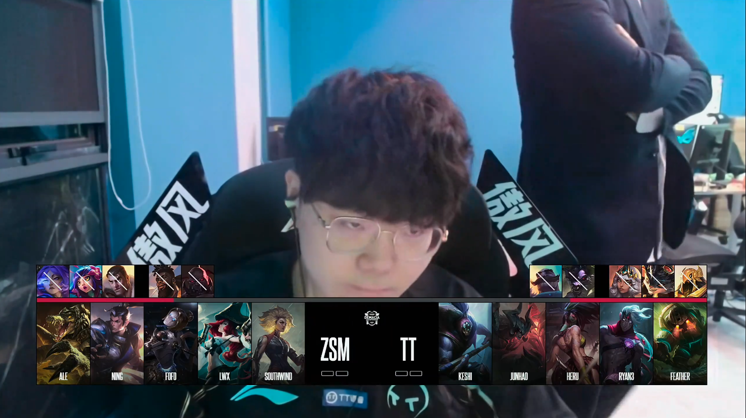 第一局比賽,ZSM藍色方,禁用:蕓阿娜;妮蔻;杰斯;奎桑提;塞恩,選用:Ale鱷魚;Ning趙信;FoFo發條;Lwx女槍;Southwind芮爾;TT紅色方,禁用:沙皇;蘭博;奇亞娜;牛頭;布隆,選用:Keshi武器;Junhao劍魔;Heru阿卡麗;Ryan3韋魯斯;Feather泰坦