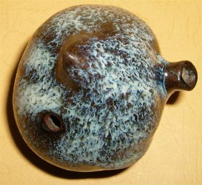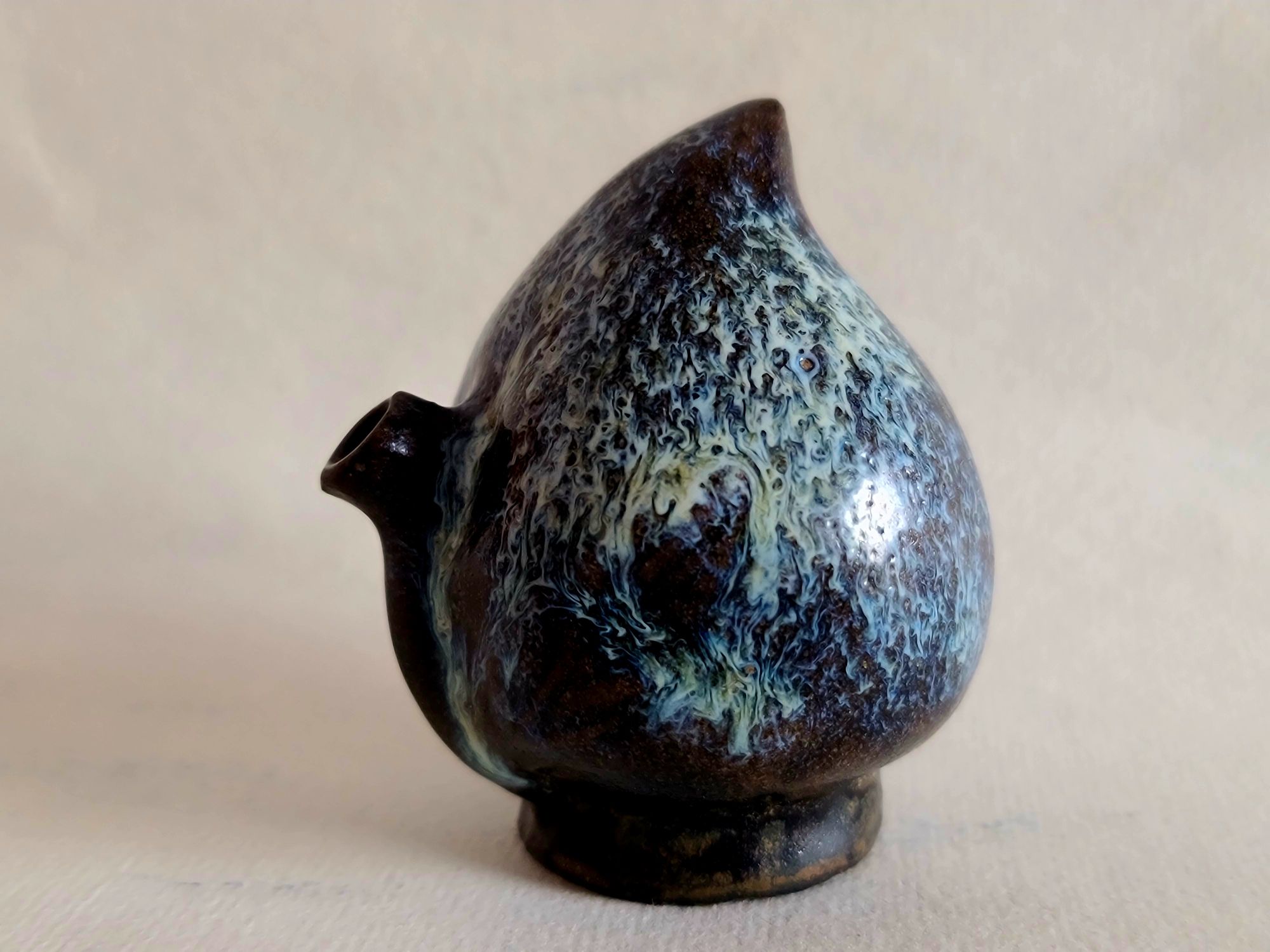 這件硯滴的發現,為鈞瓷“始于唐、盛于宋”的發展脈絡提供了有力的實物證據。學術界普遍認為,唐代魯山、郟縣等地燒制的“花釉瓷”(又稱“唐鈞”)是鈞瓷的前身。這種在黑釉或褐釉上潑灑藍、白等彩斑的工藝,為后來鈞瓷的窯變藝術奠定了基礎。五代作為唐宋之間的過渡時期,陶瓷實物相對稀少。這件桃型硯滴兼具唐代花瓷的工藝特征(如彩斑裝飾)和宋代鈞瓷的雛形(如天藍乳光釉),清晰地展示了從“唐鈞”到“宋鈞”的技術演進過程,具有承前啟后的斷代標尺意義。