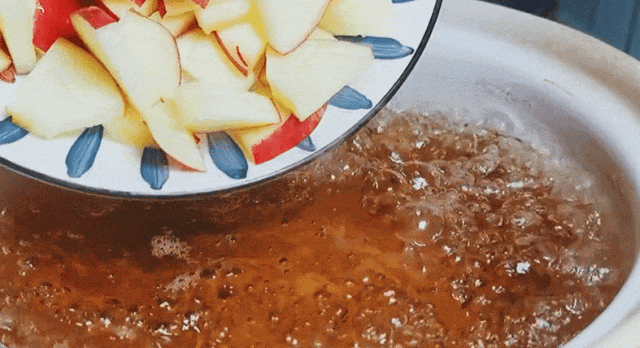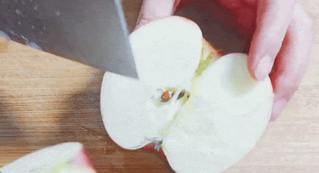 把蘋果從中間切開,再分成4瓣,用小勺挖掉果核和果核周圍的果肉——蘋果核附近含有微量氫氰酸,吃多了可能頭暈惡心,這部分一定要去掉。處理好的蘋果切成0.5厘米厚的薄片,放進盤中備用,別泡在水里,以免流失維生素。