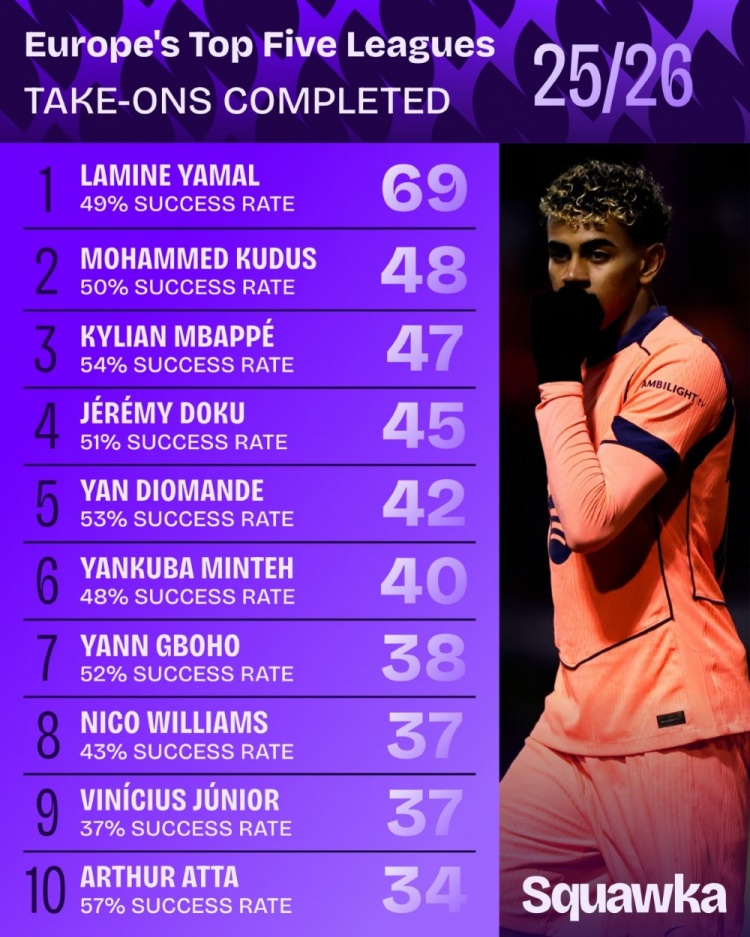 翻開五大聯(lián)賽過人數(shù)據(jù)統(tǒng)計,亞馬爾的領(lǐng)先優(yōu)勢令人難以置信。這位巴薩小將在本賽季已完成的過人次數(shù)比第二名高出近15次,成功率更是達到驚人的68%。相比之下,排名第二的姆巴佩場均3.1次成功過人已屬頂級,但依然與亞馬爾有著明顯差距。