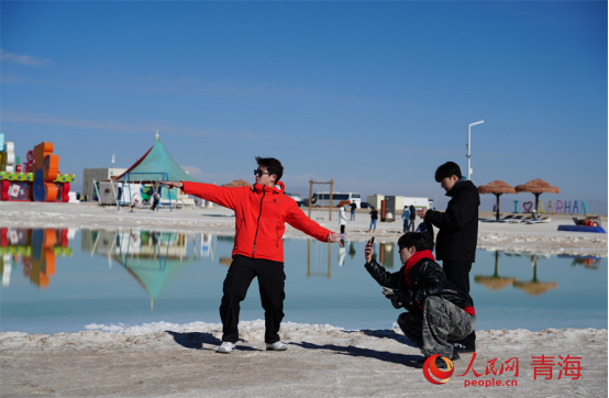 游客正在察爾汗鹽湖拍照打卡。人民網(wǎng)馬可欣攝