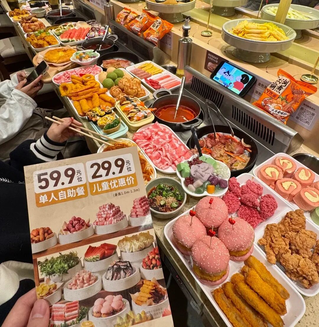 優鼎優自助小火鍋:“火鍋+烤肉”雙自助模式,最高日排超2000桌,品類融合的集大成者,同一團隊打造的“升級版舉高高”,最大看點是“59.9元火鍋+烤肉雙自助”,并融合披薩、壽司、糖葫蘆等,被顧客稱為“旋轉臺上的7-11”,據了解,其毛利僅有48%,足見其背后的供應鏈能力有多生猛。