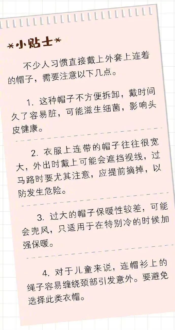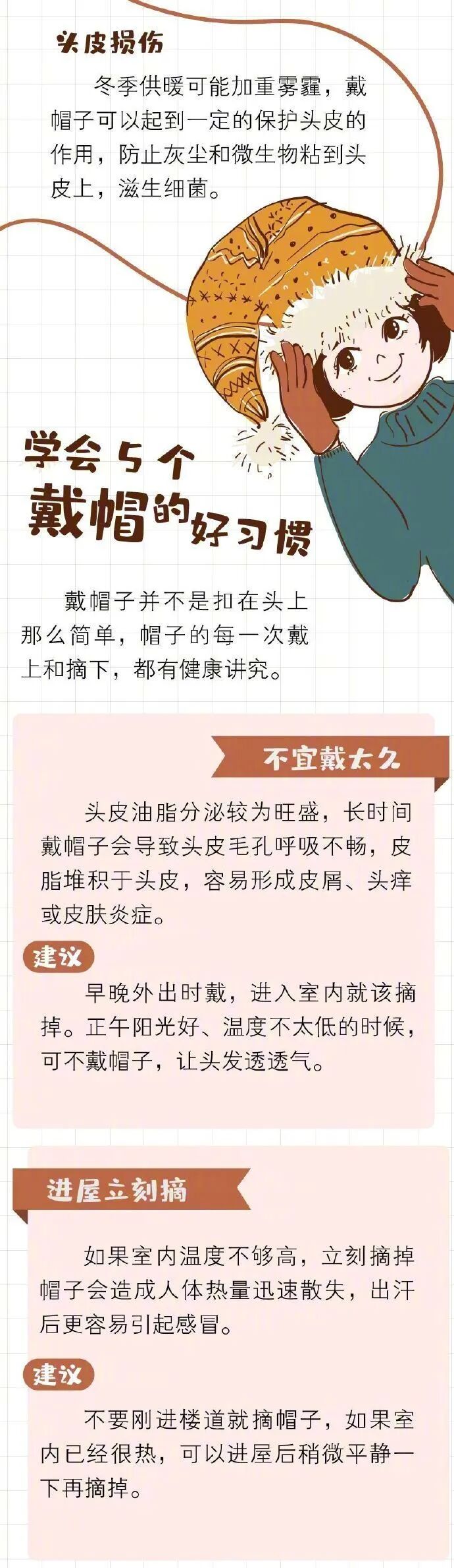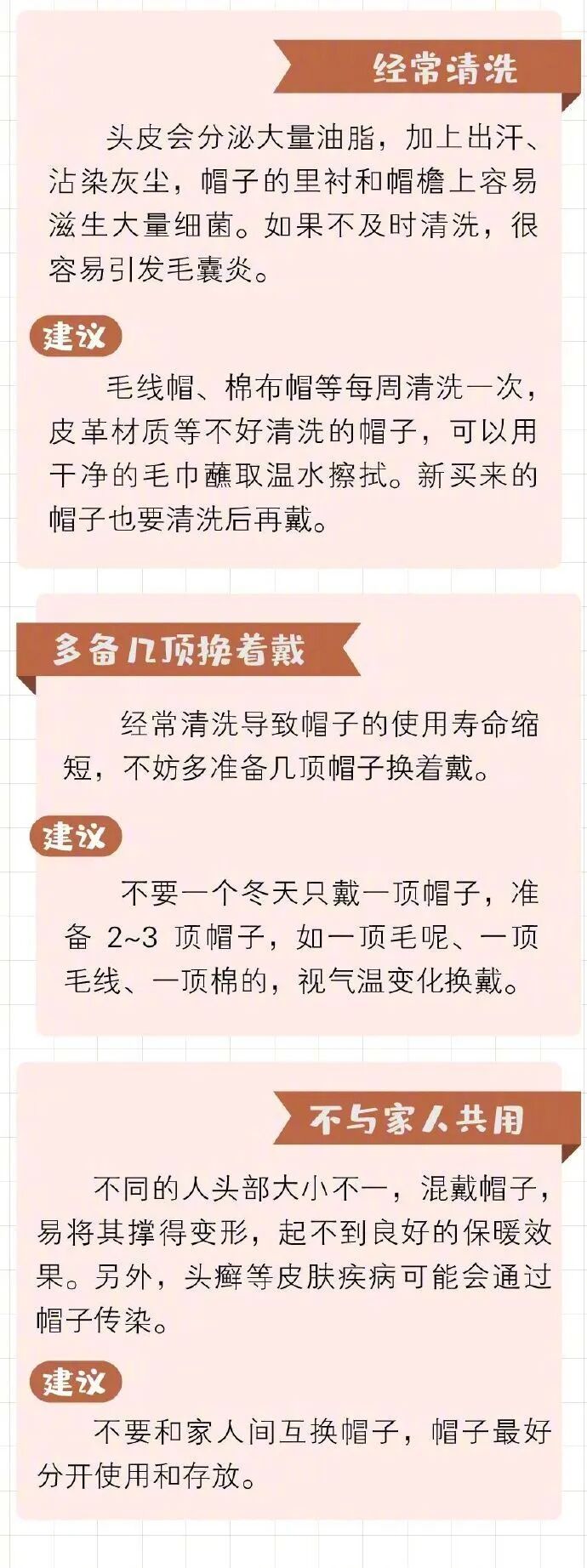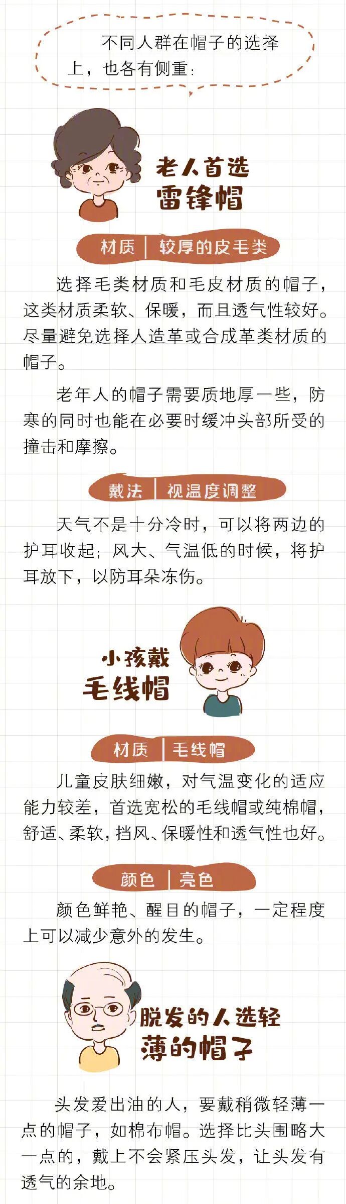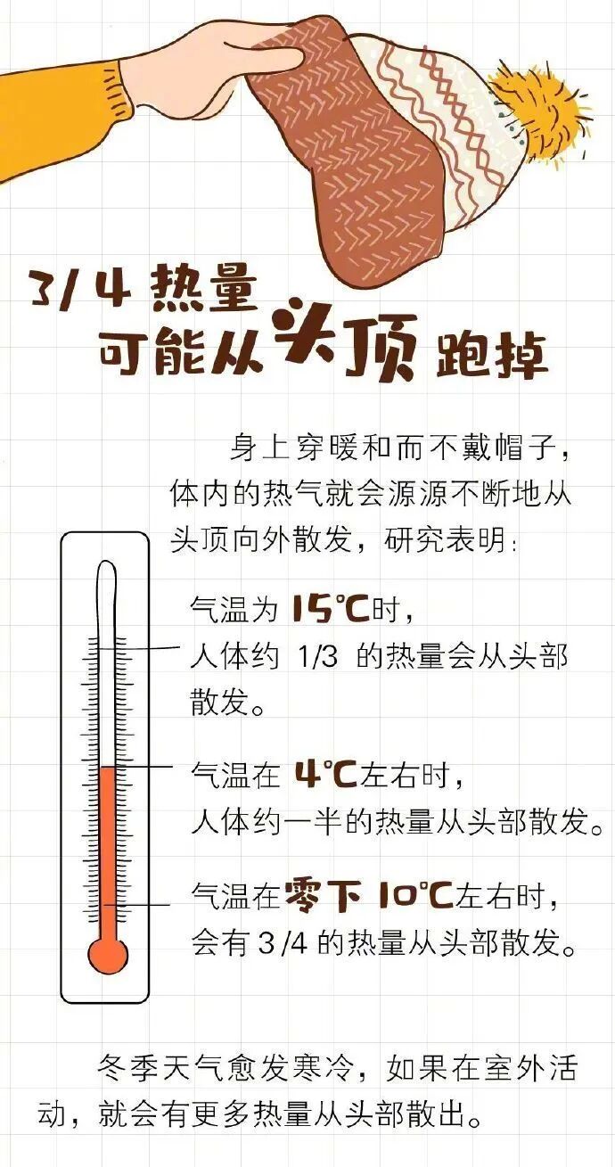 為了防寒,人們外出時總會穿上厚厚的冬裝,但很多人卻沒有戴帽子的習慣。實際上,頭部血管、神經密集,是人體散發熱量最大的部位之一,做好頭部保暖非常關鍵。有研究表明,靜止狀態下不戴帽子,氣溫15℃時,人體約1/3的熱量會從頭部散發;而氣溫在4℃左右時,約一半的熱量從頭部跑掉。