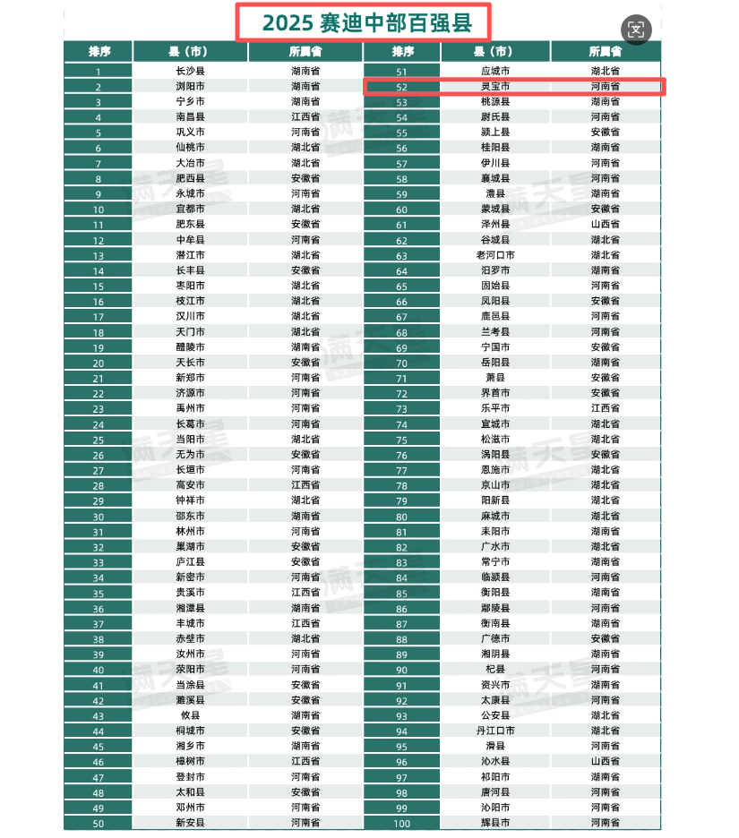 近日,賽迪顧問發布2025中西部縣域經濟高質量發展研究成果,公布了“2025年賽迪中部百強縣”榜單。靈寶市再度入選,位列總榜第52位。在河南省上榜的30個縣(市)中排名第16位,同時也是三門峽市唯一入選的縣(市)。這已是靈寶市連續第6年登上該榜。