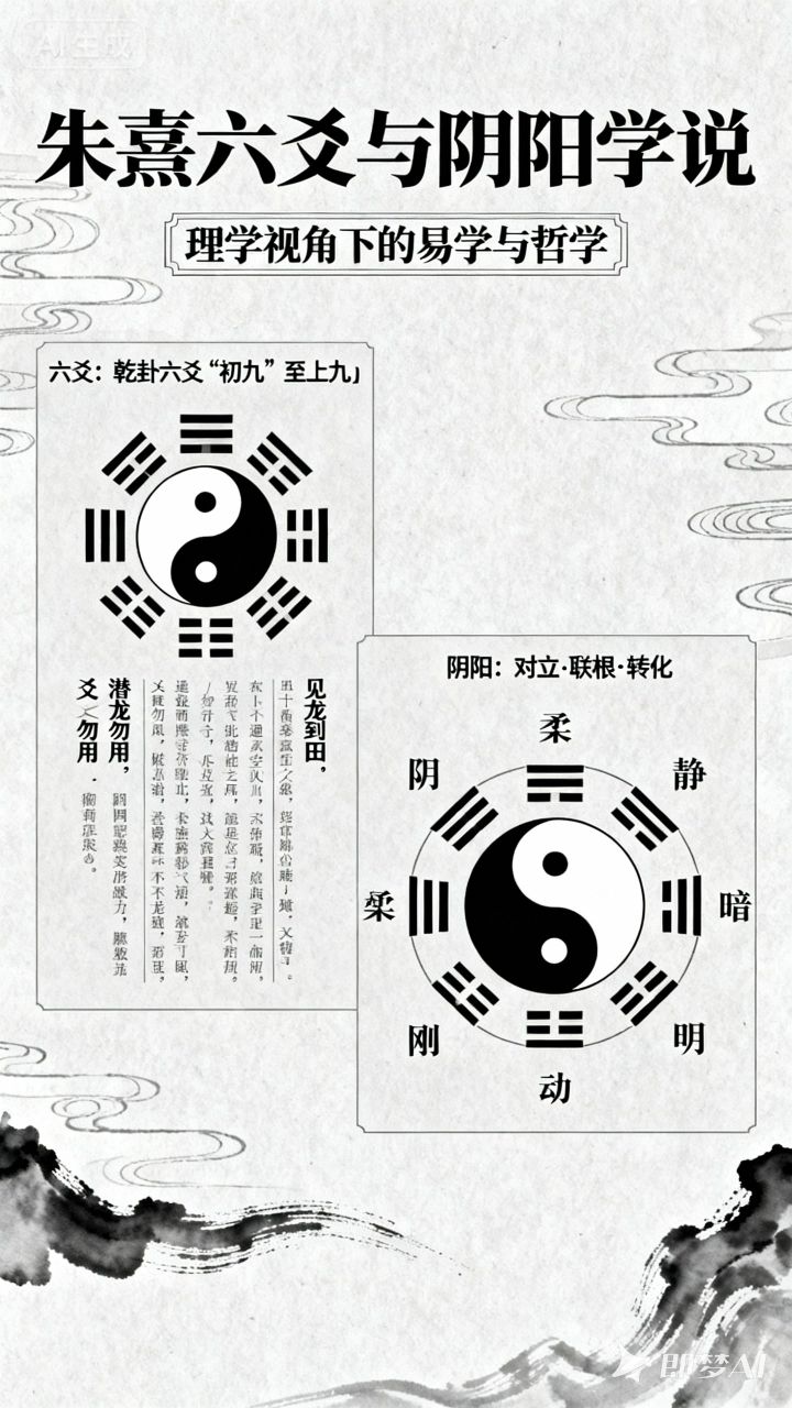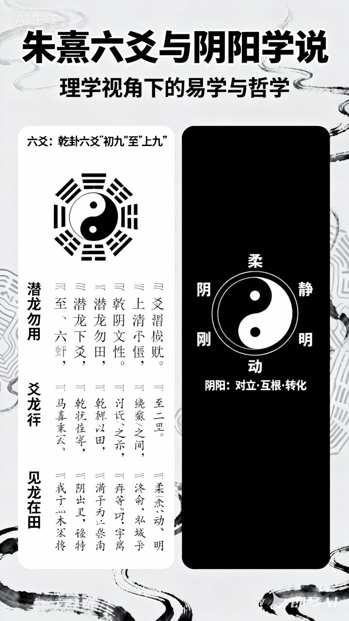 - **六爻變化體現陰陽法則**:朱熹強調陰陽變易是《周易》的基本法則,卦爻象的變易就是一陰一陽卦畫的相互推移。就如同陰陽之氣有進有退、有消有長,萬物萬事都依此消長變易而出,六爻的變化也遵循陰陽變易的規律。