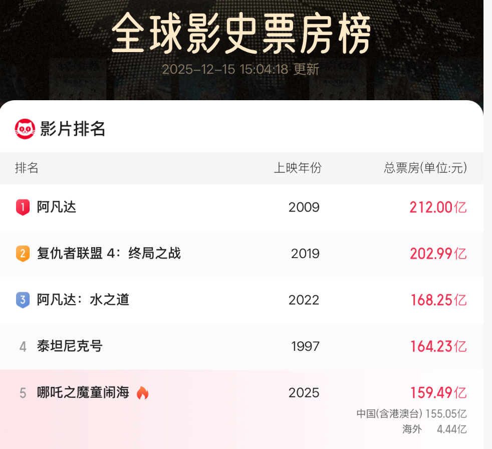 全球影史票房顯示,《阿凡達》第一部總票房212億元排名第一,《復仇者聯盟4:終局之戰》總票房202.99億元排名第二,《阿凡達:水之道》總票房168.25億元排名第三。前三名中,《阿凡達》系列已獨占兩席。