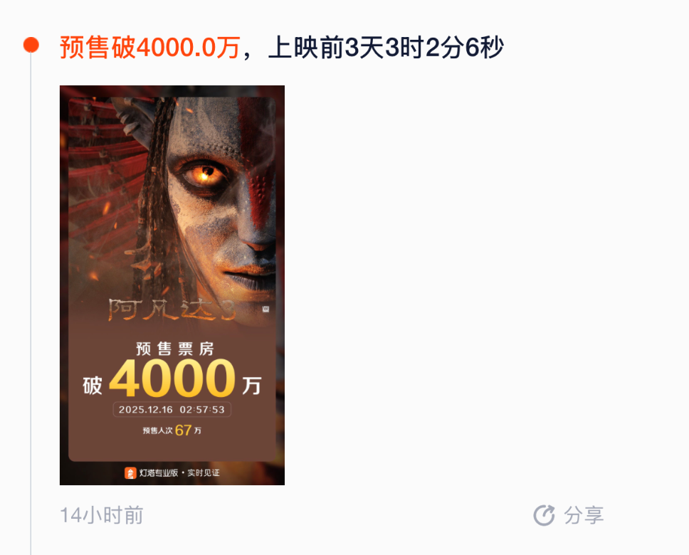 據燈塔專業版實時數據,截至12月16日,影片《阿凡達:火與燼》(下稱《阿凡達3》)預售總票房突破4000萬元。