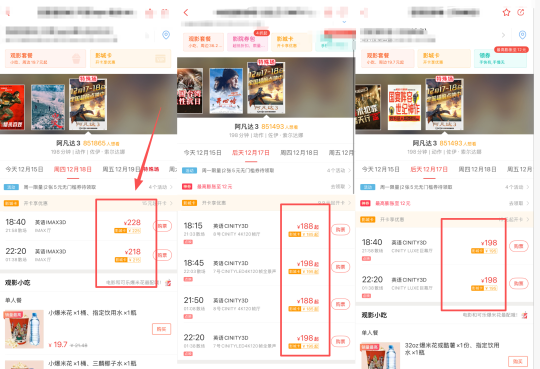 藍鯨記者發現,點映期間有影院票價高達228元一張,其余百元以上的高票價場次主要集中在IMAX 3D、CINITY LED等特效廳。相比之下,普通影廳的票價基本在百元以下。