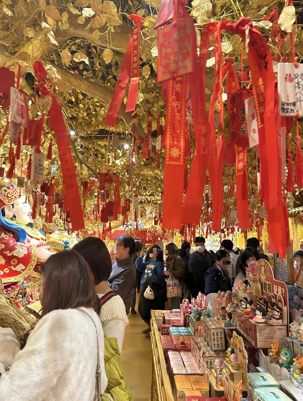 王澤覺得很好玩,順手抓起兩張功德盆里的紙幣便與財神像合影,在拍下幾十張照片后,他才開始審視店內(nèi)真正的「正菜」——那些承載著好運寓意的小物件。