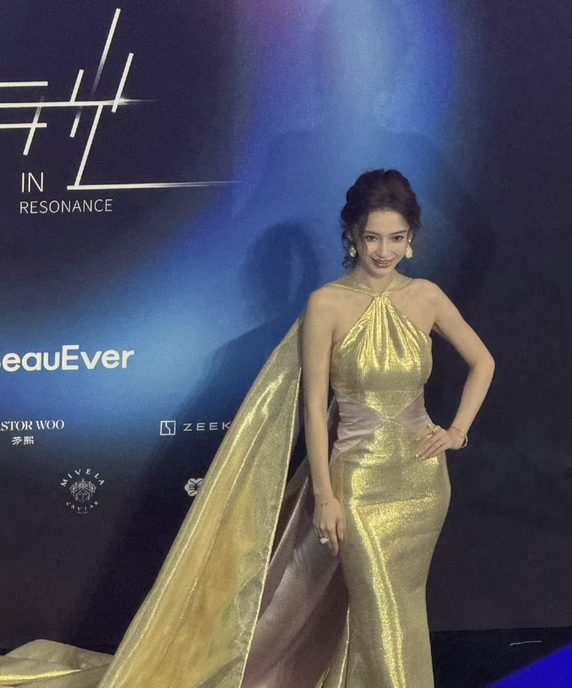 當晚,Angelababy身著Alexis Mabille 2024秋冬鎏金高定長拖尾禮服登場,金銀絲織物與亮片交織的面料在燈光下流淌著細碎光澤,掛脖設計精準勾勒優越肩頸線條,搭配微卷麻花辮與Boucheron珠寶,被網友盛贊為"在逃公主與艾莎的跨次元融合"。作為與她第六次攜手的法國高定品牌,這套禮服完美呼應了"有趣而有力"的設計理念,長拖尾披肩隨步伐搖曳生姿,每一步都自帶星光氣場。