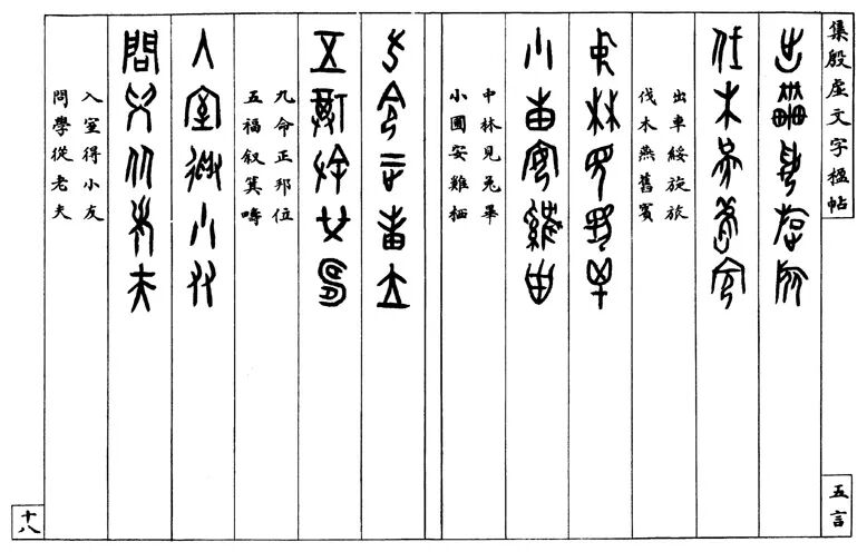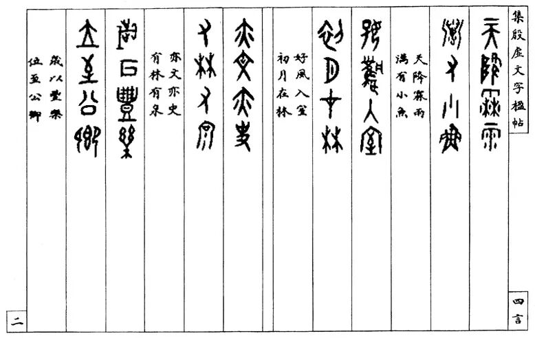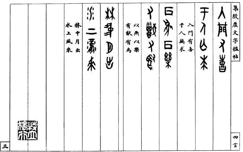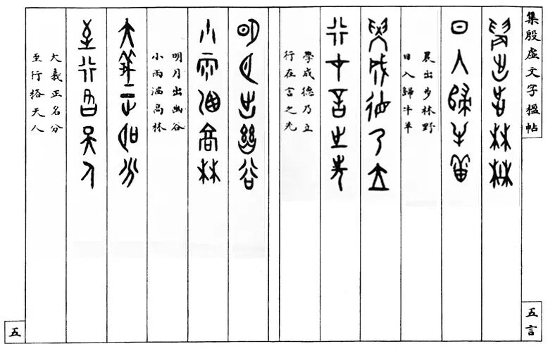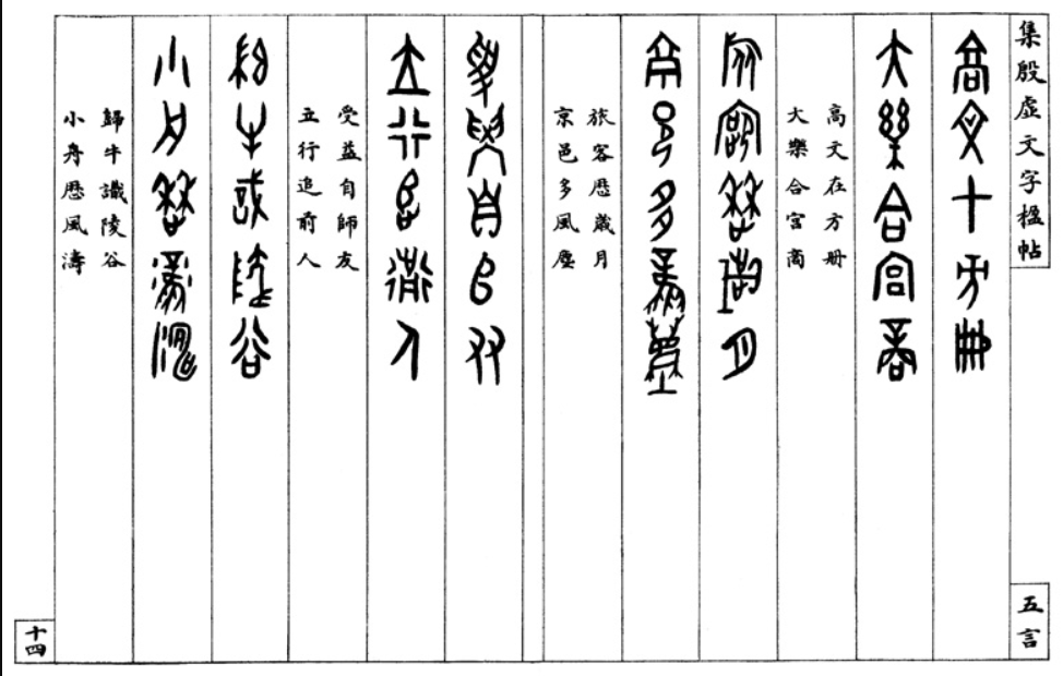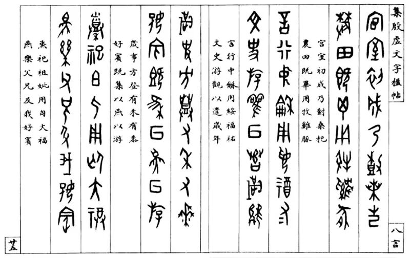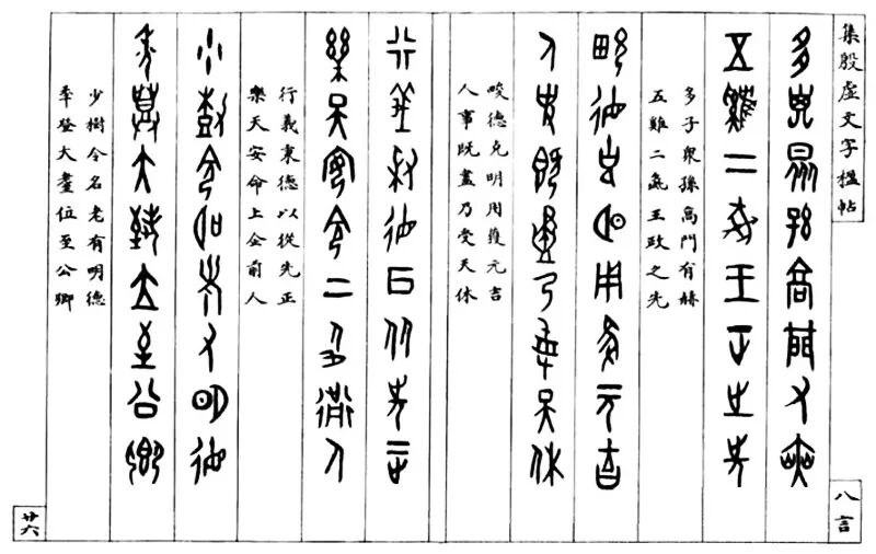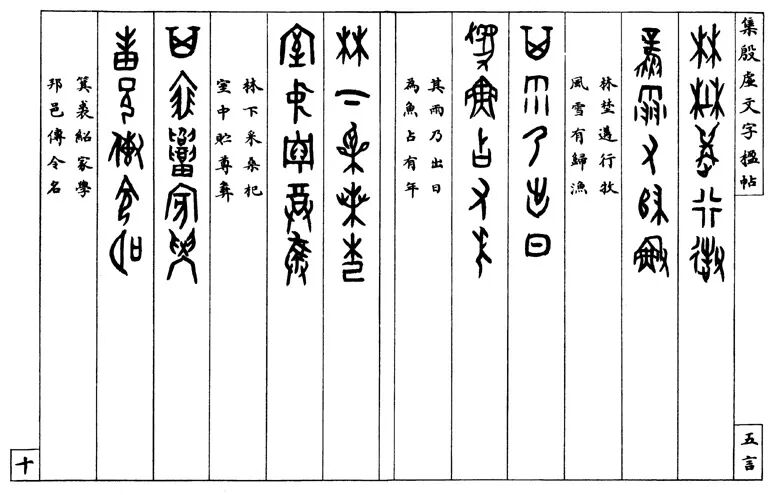 自序:自客津沽,人事旁午,讀書之日幾廢大半。去冬,奔走南北,匍匐振災,四閱月間,益無寸晷。昨以小憩塵勞,取殷契文字可識者,集為偶語,先后三日夕,遂得百聯,存之巾笥,用佐臨池。辭之工拙,非所計也。辛酉(1921年)二月,雪翁記于嘉樂里寓之殷禮在斯堂。