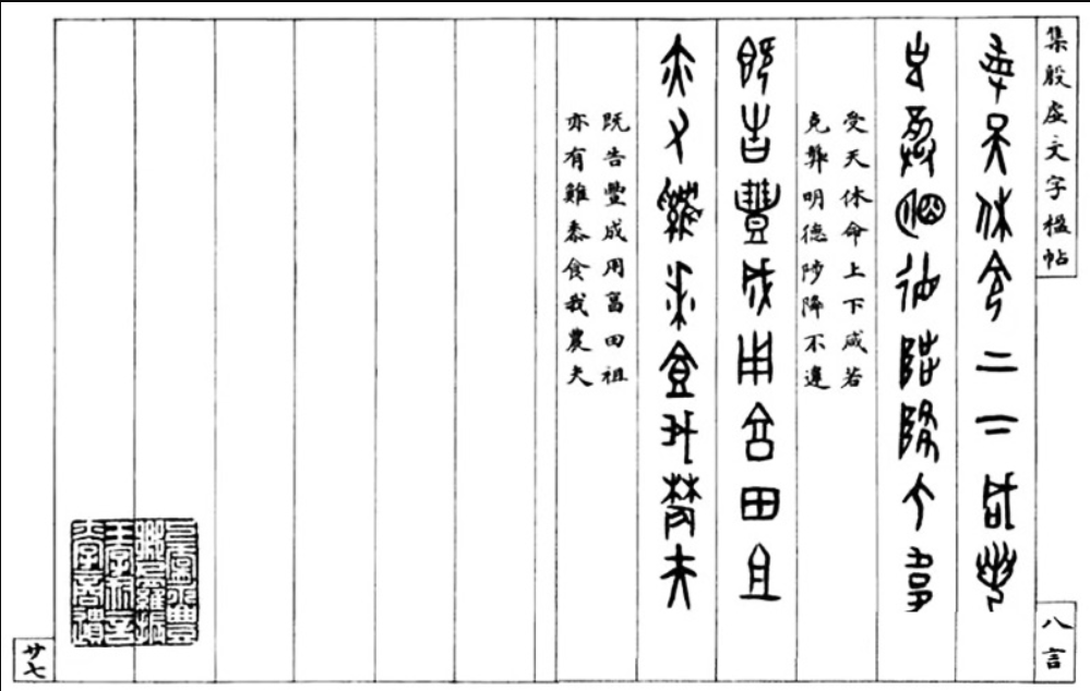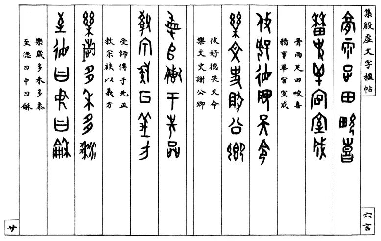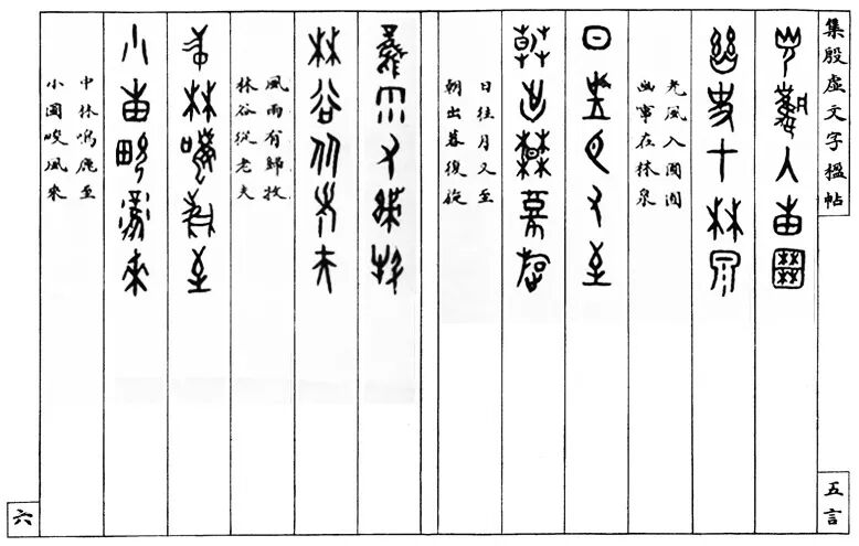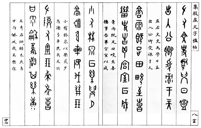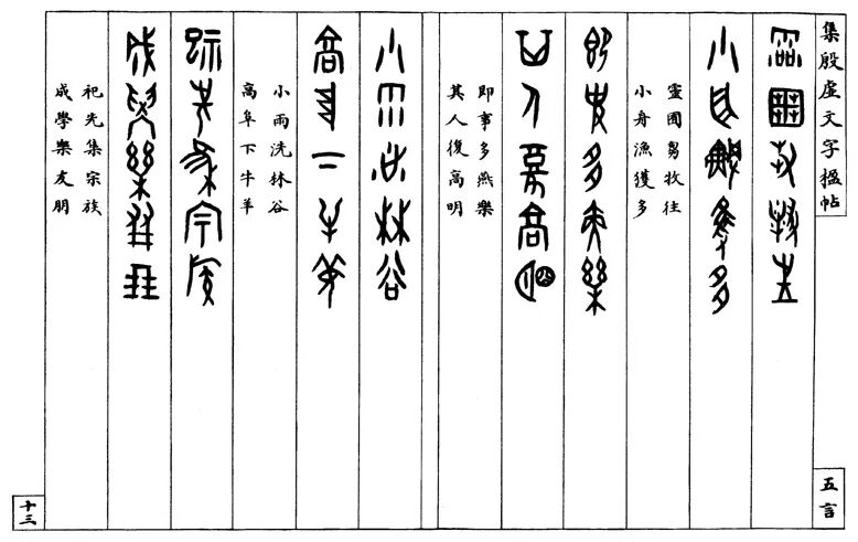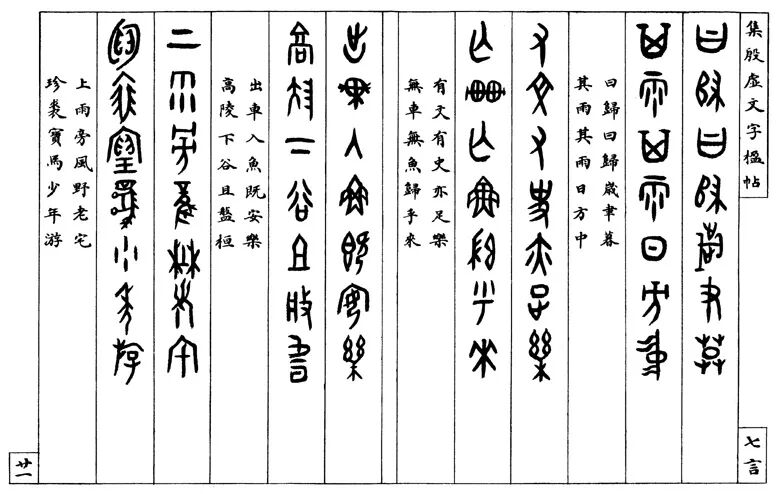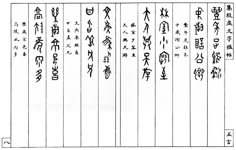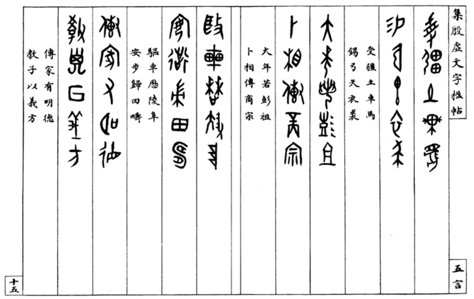 自序:自客津沽,人事旁午,讀書之日幾廢大半。去冬,奔走南北,匍匐振災,四閱月間,益無寸晷。昨以小憩塵勞,取殷契文字可識者,集為偶語,先后三日夕,遂得百聯,存之巾笥,用佐臨池。辭之工拙,非所計也。辛酉(1921年)二月,雪翁記于嘉樂里寓之殷禮在斯堂。