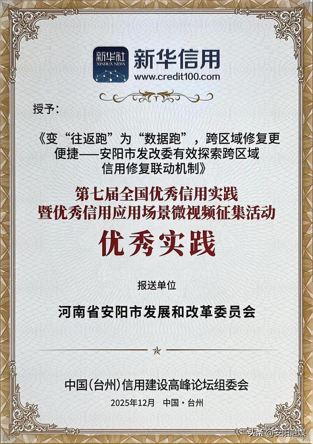 12月18日,記者從市發展和改革委員會獲悉,在第七屆中國城市信用建設高峰論壇發布的全國優秀信用實踐暨優秀信用應用場景微視頻名單中,我市申報的《變“往返跑”為“數據跑”,跨區域修復更便捷——安陽市發展改革委有效探索跨區域信用修復聯動機制》案例,從全國1767個參評案例中脫穎而出,獲評全國信用應用場景優秀實踐,安陽“數據跑”替代“企業跑”的創新模式獲國家級認可。