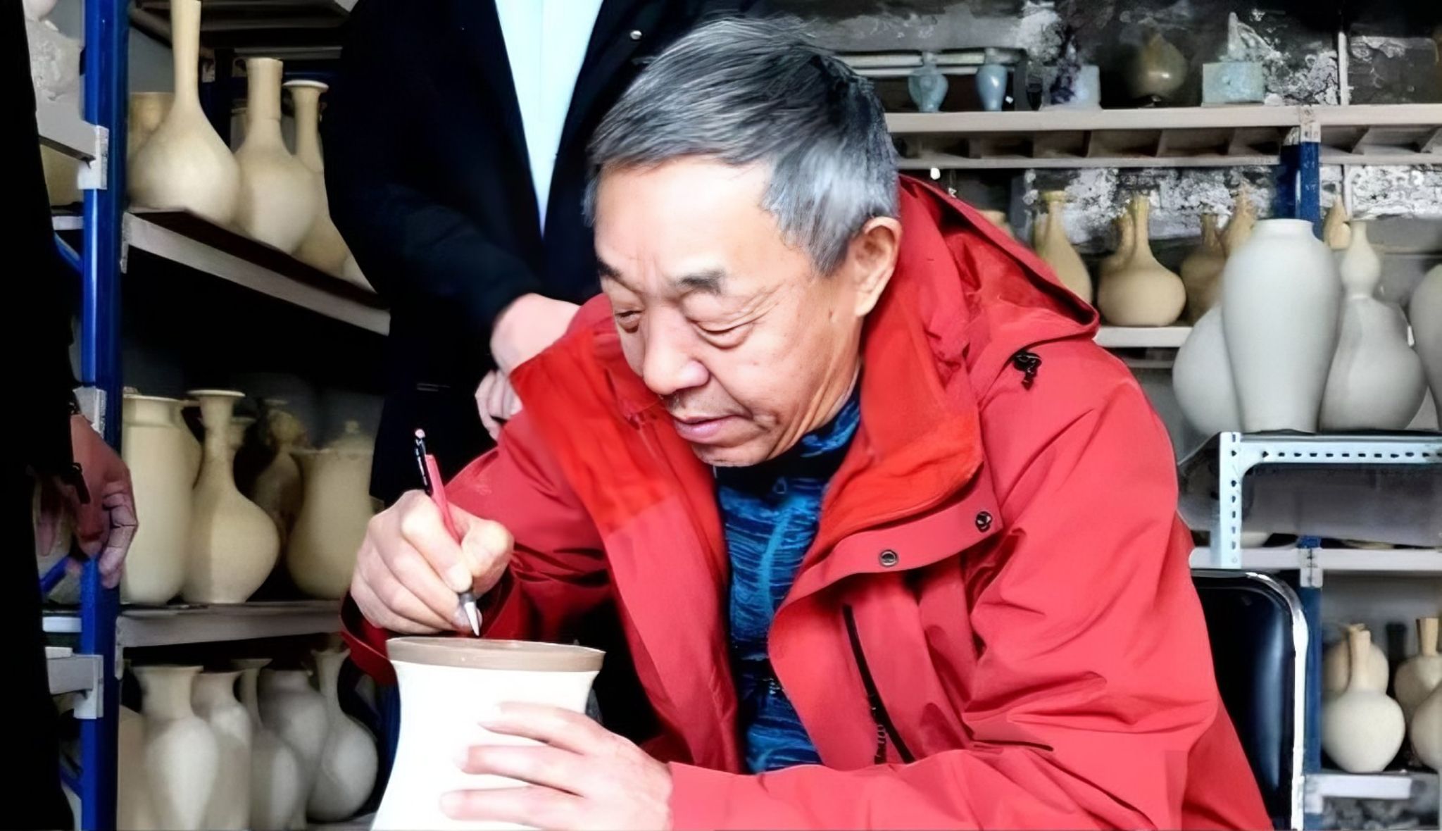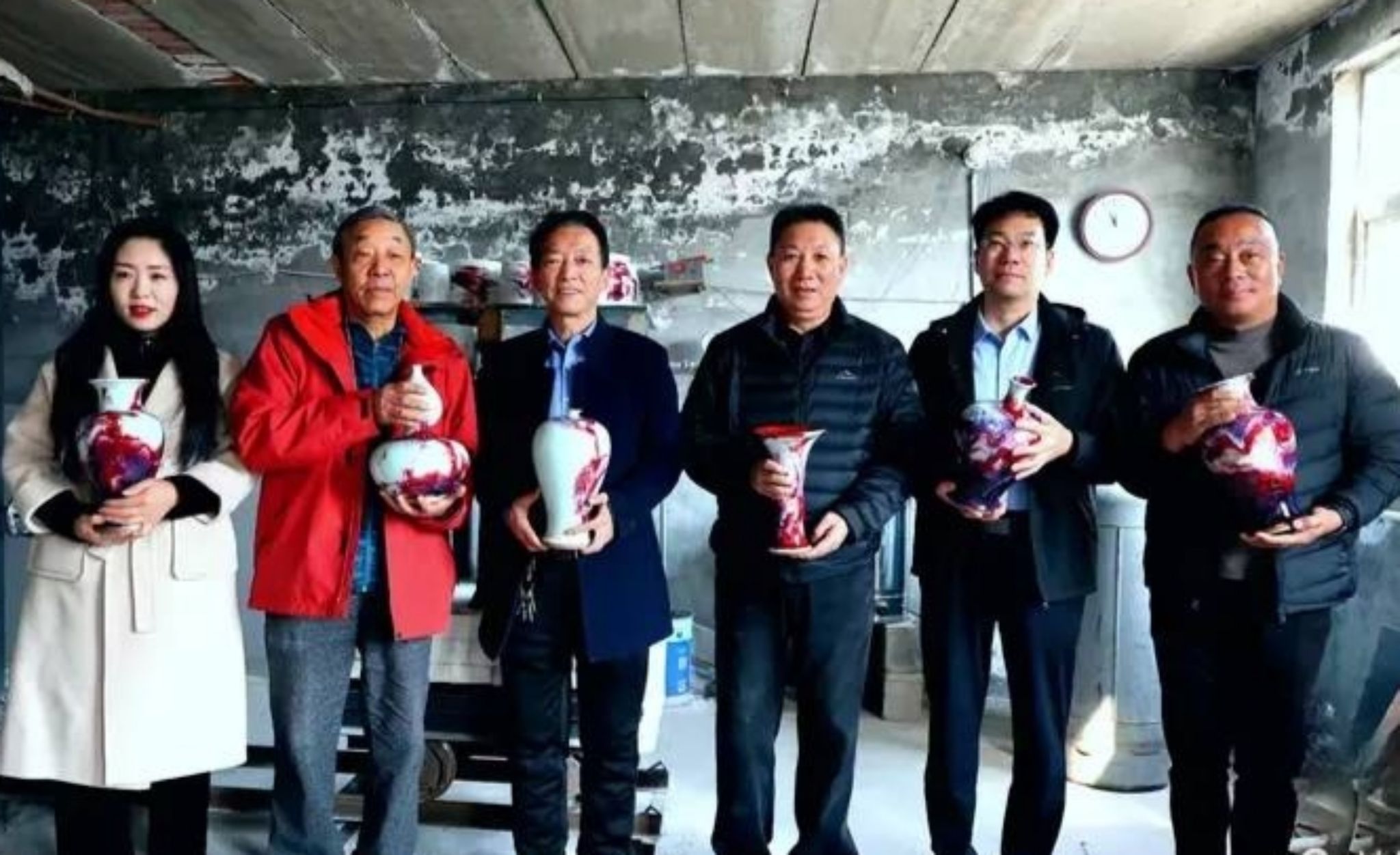 循著窯火的余溫,一行人驅車前往神垕古鎮的生產基地。這座曾為宋皇室專供鈞瓷的古鎮,至今仍回蕩著土與火的呢喃。當窯門緩緩開啟,溫熱的氣息裹挾著柴火余韻撲面而來,工人師傅小心翼翼捧出帶著窯溫的鈞瓷,絢爛釉色宛如天地造化的瑰寶。忽然,幾聲清脆的"開片"聲響起,如箏鳴悠遠,似罄音綿長,那是泥土、烈火與時間交織的天籟,讓人沉醉在"家有萬貫,不如鈞瓷一片"的極致韻味中。開窯之后,肖紅大師與付清臣大師在素胎上共同簽名,將相聚的情誼與對鈞瓷的期許,鐫刻在承載千年文脈的瓷土之上。
