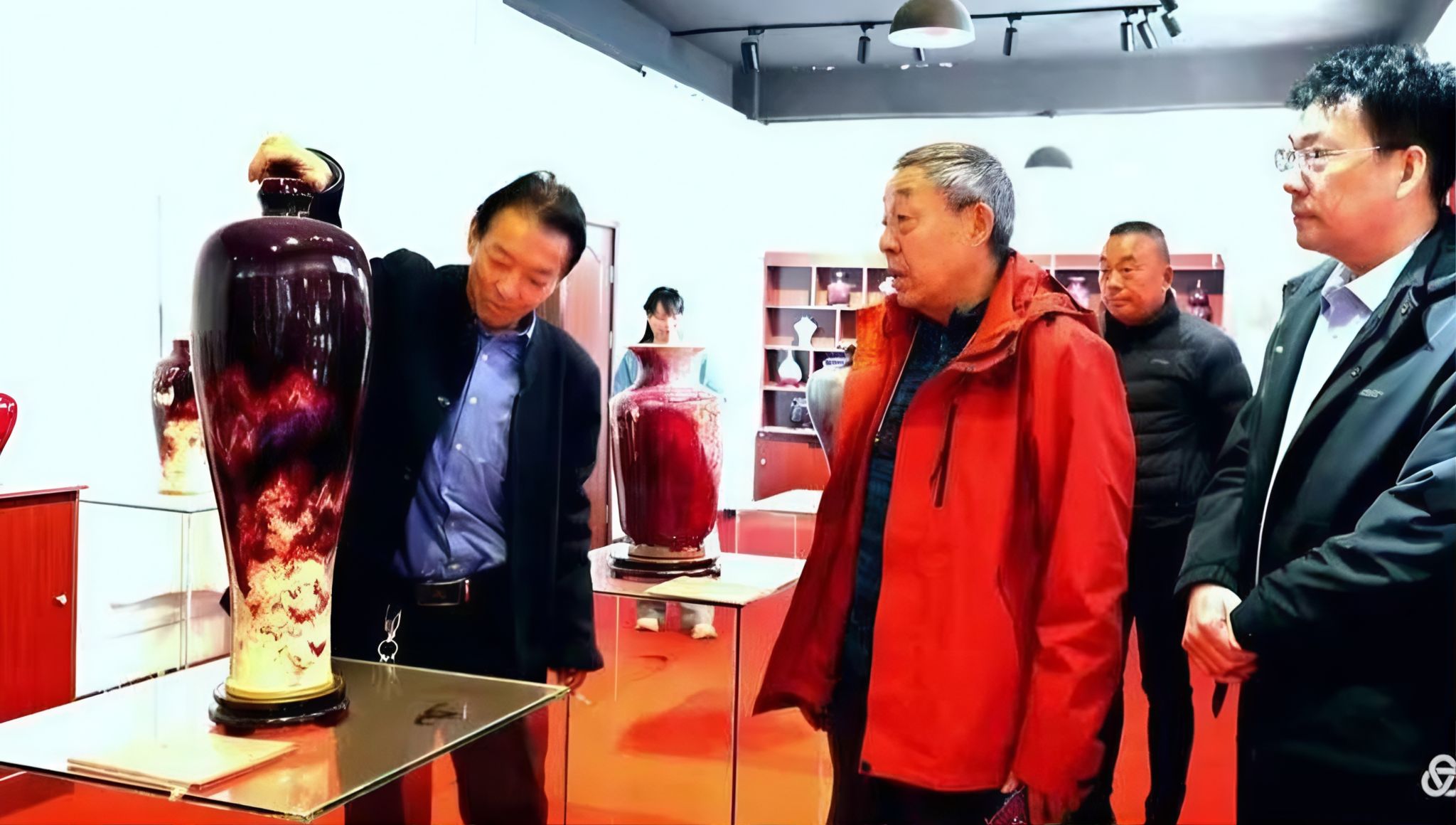 國際鈞瓷藝術大師付清臣攜弟子、御都鈞窯董事長朱向前,早已在接待大廳等候。當香港澳門區旗區徽設計者肖紅大師、國之寶藏投資董事王立江、平頂山學院藝術設計學院院長劉斐一行踏入院中,老友重逢的歡悅與對鈞瓷的敬意相融,讓這場相聚更添溫情。無需過多寒暄,眾人便循著瓷香,步入國禮展廳探尋秘境。