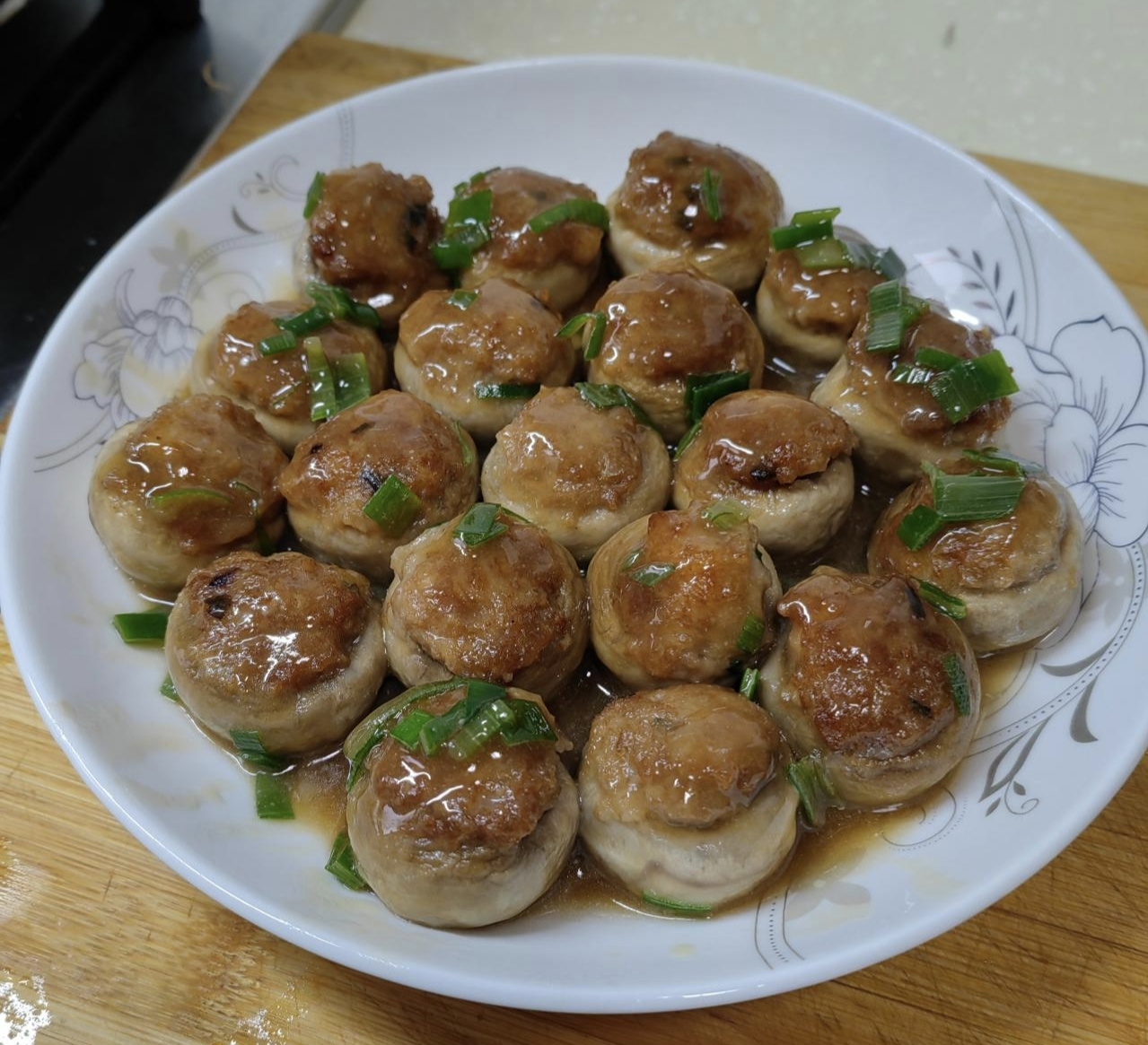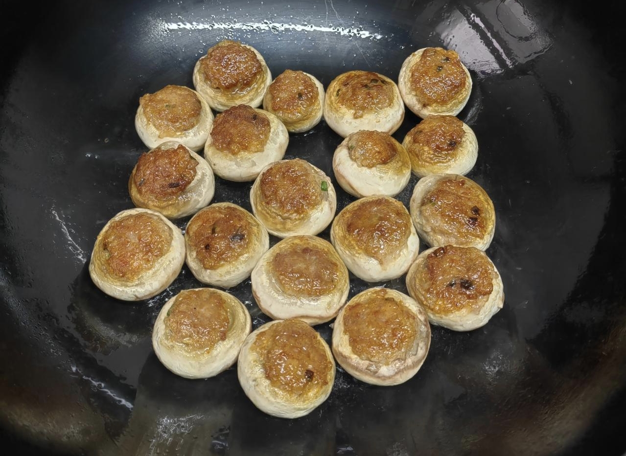 3、把肉餡分別放到口蘑的底部,勺子壓一壓,炒上在盤中擺好。
