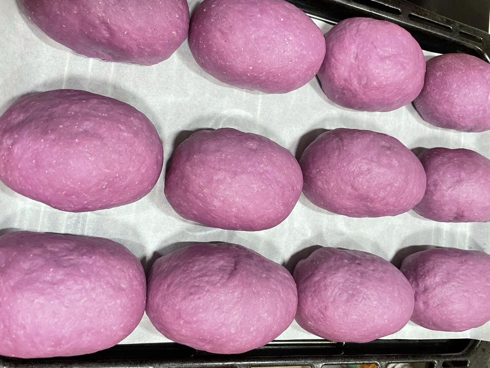 3、發酵后的面團揉到細膩的狀態,分成均等的小份。分別揉一揉,包上紫薯球,然后擺到蒸鍋里。