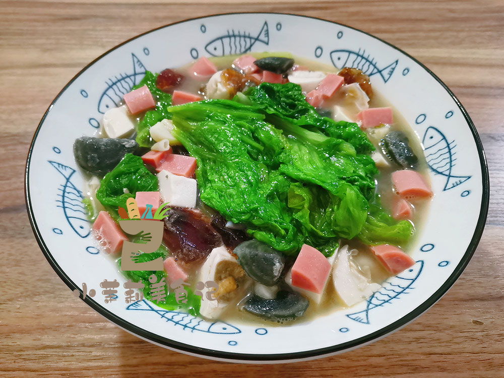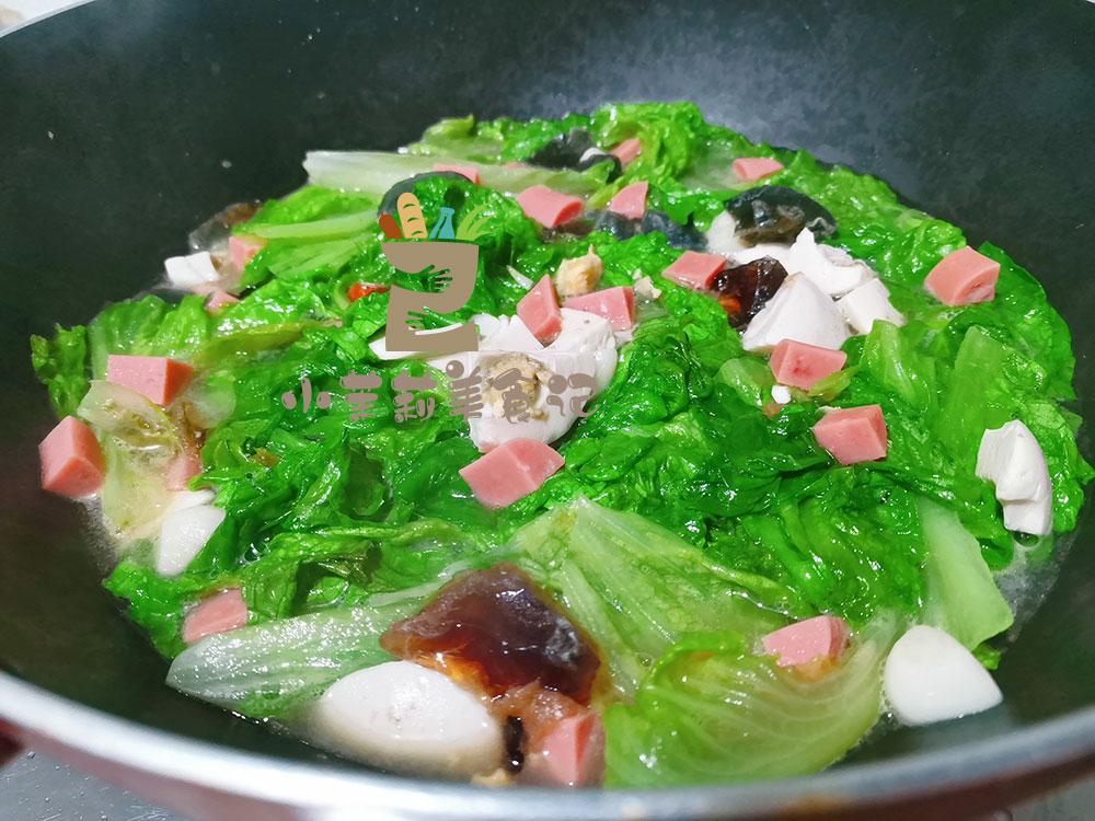 4、湯汁煮個兩分鐘,生菜放進去即可關火,湯汁的余熱足以令生菜斷生??焖俪鲥佈b盤。