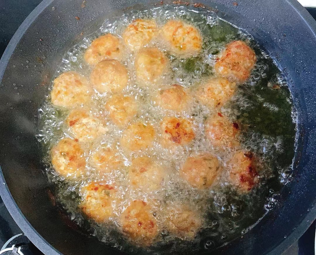 4、鍋里倒上寬油,將其燒熱了,把餡料一個個整理成丸子放進去,很快就飄起來了,個個焦黃,撈起控油裝盤即可。