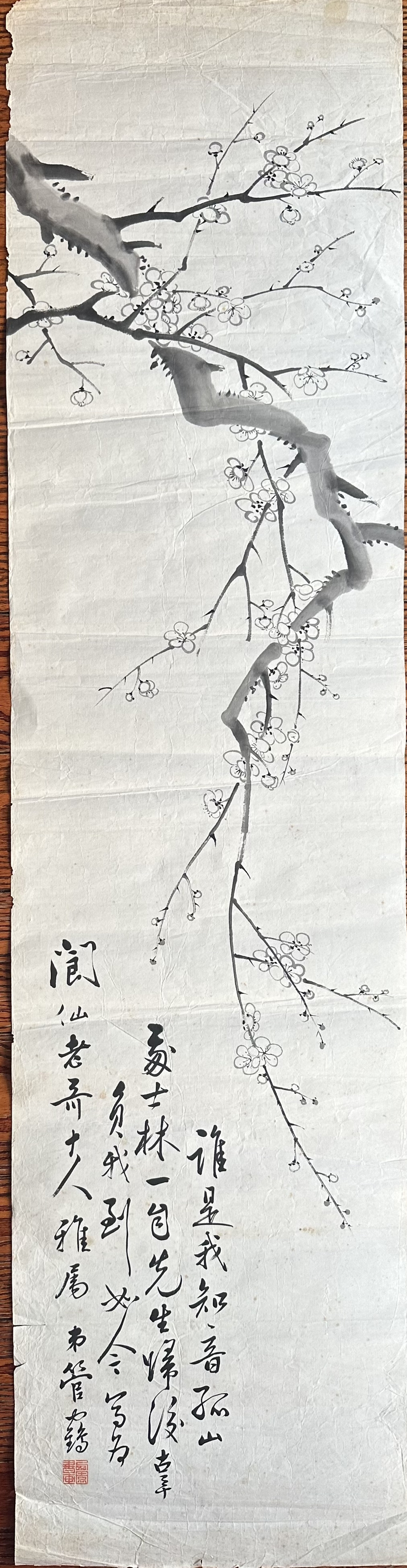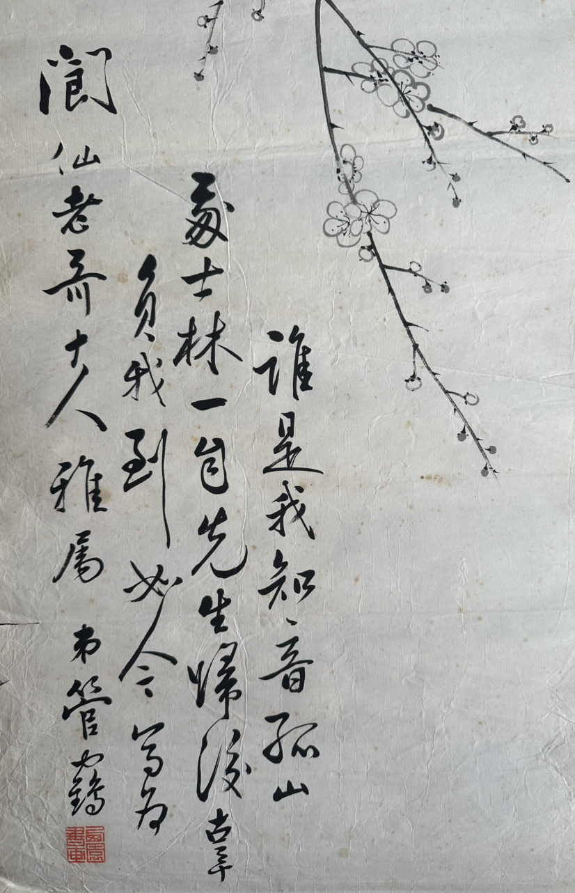 余手上的《墨梅圖》138X34.5cm,水墨紙本單片。畫筆元、明,有元人王冕的清絕之氣,用筆簡練,墨色淡逸。亦有明人陳繼儒神清氣爽,高標清脫和筆清墨潔。有"不要人誇好顏色,只留清氣滿乾坤"的意境。落款"二王"行書,淡雅清和,與墨梅氣味相投。署題宋人樓盤《霜天曉月》下班闋:"誰是我知音。孤山人姓林。一自先生歸後,辜負我,到如今。"上款"寫為閬仙老哥大人雅屬,落名"弟管鶴",鈐印"西園書畫"朱文。畫家把原詞"一自西湖別後",改為"一自先生歸後"。
