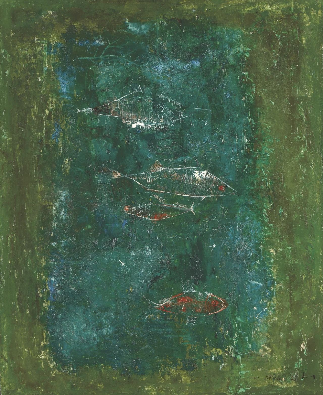 在〈魚(yú)〉系列作品中,深綠色的背景如潑墨般暈染開(kāi)來(lái),魚(yú)的形體不再有明確的輪廓,僅以虛線與肌理暗示,彷彿遊動(dòng)於水氣氤氳的深潭之中,營(yíng)造出「潭中魚(yú)可百許頭,皆若空遊無(wú)所依」的東方詩(shī)意。這種創(chuàng)作方式,正是中國(guó)傳統(tǒng)美學(xué)「虛實(shí)相生」的體現(xiàn)——畫(huà)面中沒(méi)有具象的符號(hào),卻處處皆是意境的流露。在抽象風(fēng)景系列裡,趙無(wú)極以縱向的線條模擬樹(shù)木的生長(zhǎng)之態(tài),色彩的漸變?nèi)邕h(yuǎn)山的層巒疊嶂,整個(gè)畫(huà)面渾然一體,讓觀者在視覺(jué)體驗(yàn)中感受到「行到水窮處,坐看雲(yún)起時(shí)」的精神境界。