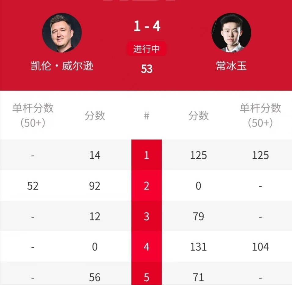 而在世界排名第70位的常冰玉,與世界排名第5位的世錦賽冠軍“囧哥”凱倫-威爾遜的比賽中,他在一開局就轟出單桿125分,給了“囧哥”一個下馬威,最終以4-1的比分輕松戰勝對手晉級八強。祝賀江俊、常冰玉,期待他們在1/4決賽繼續有出色發揮!