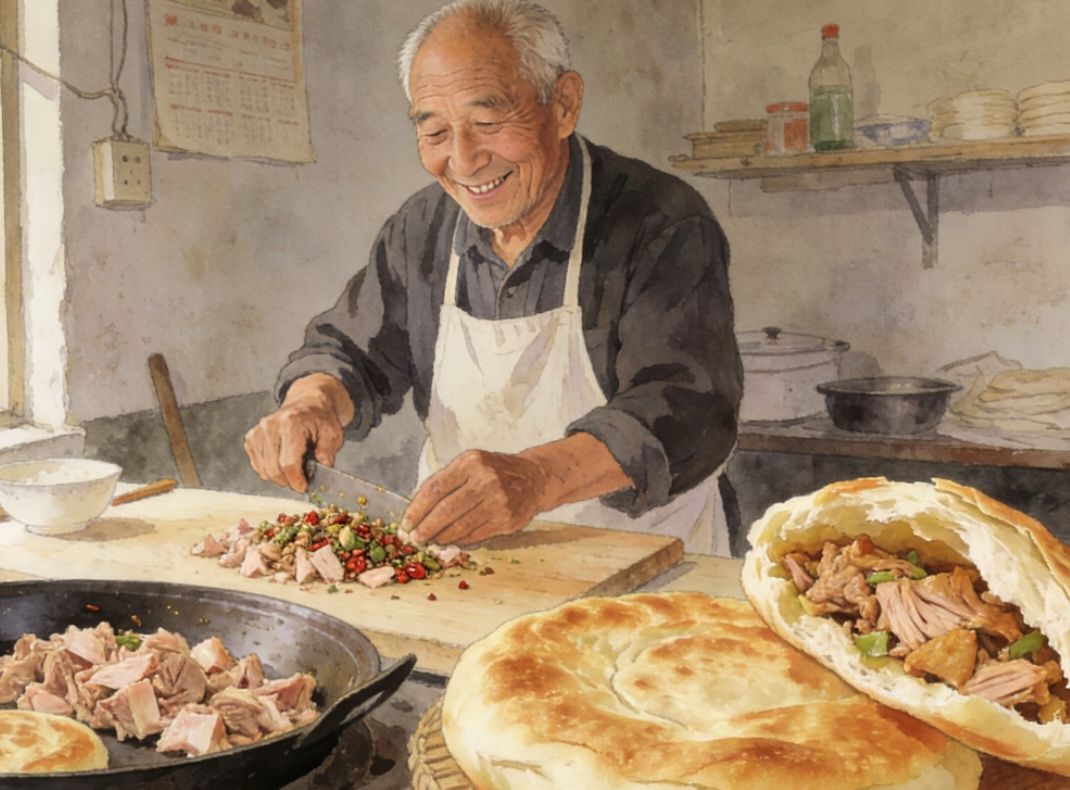下山時路過一家不起眼的小店,沒想到竟嘗到了汝南特色雞肉饃。老板武大安老人守著這門手藝已有21年,從挑選新鮮雞肉到調制餡料,每一步都親力親為,不添加任何防腐劑 。
