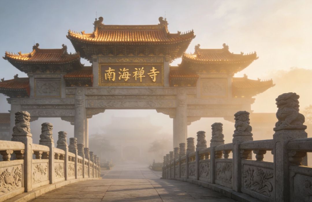 清晨的汝南還浸在薄霧里,我們直奔城南的南海禪寺。還未入寺,高32米、寬50米的山門牌樓已讓人駐足驚嘆,"南海禪寺"四個斗金大字在晨光中熠熠生輝,屋頂十萬片琉璃瓦折射出莊嚴的光澤。