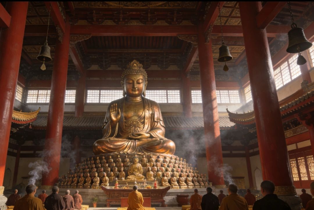 最震撼的當屬大雄寶殿,這座被載入基尼斯紀錄的世界最大大雄寶殿,99根紅柱撐起36米高的重檐殿堂,比故宮太和殿還要寬闊。踏入殿內,17米高的銅雕鎏金釋迦牟尼坐像莊嚴肅穆,周身3000尊小佛像錯落有致,檀香裊裊中,檐角風鈴輕輕作響,瞬間撫平了旅途的喧囂。