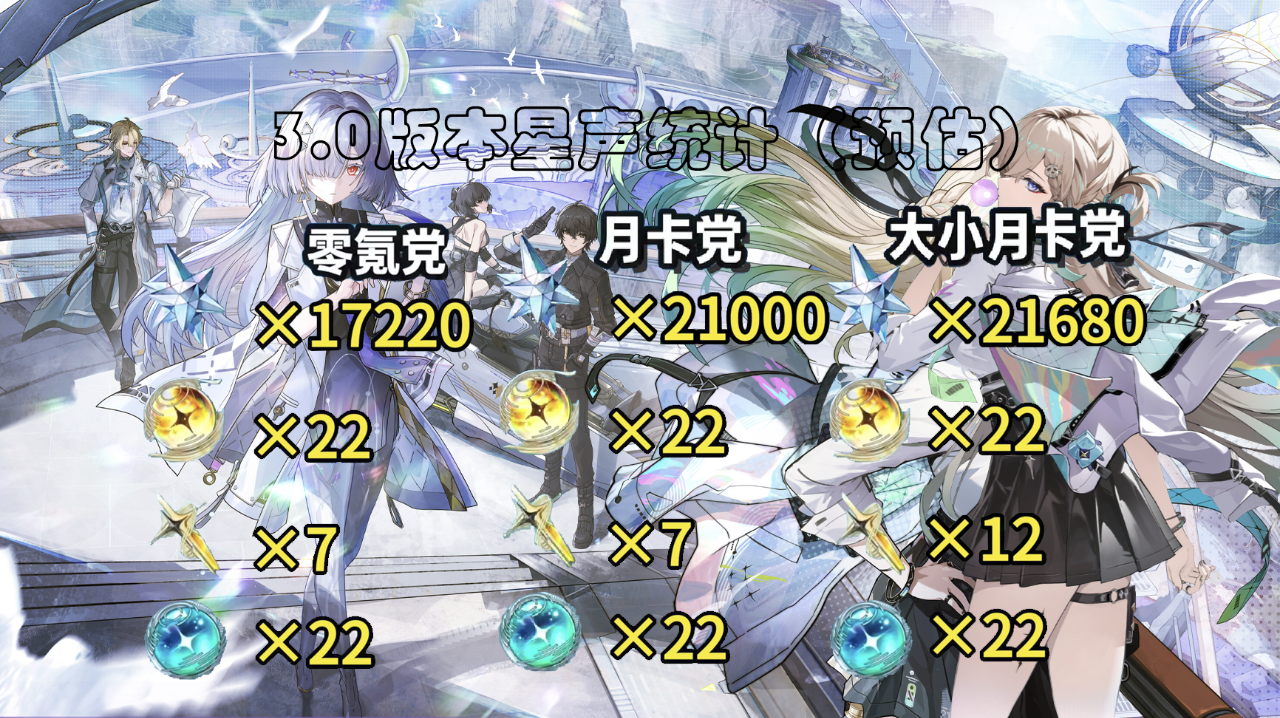 即便是平民玩家,在3.0版本也能獲得17220星聲,小月卡玩家相對多一點,可以達到21000星聲,大小月卡玩家則是21680星聲,性價比不是太高,這么一來,平民玩家在3.0版本抽個琳奈或者莫寧問題基本上不大。
