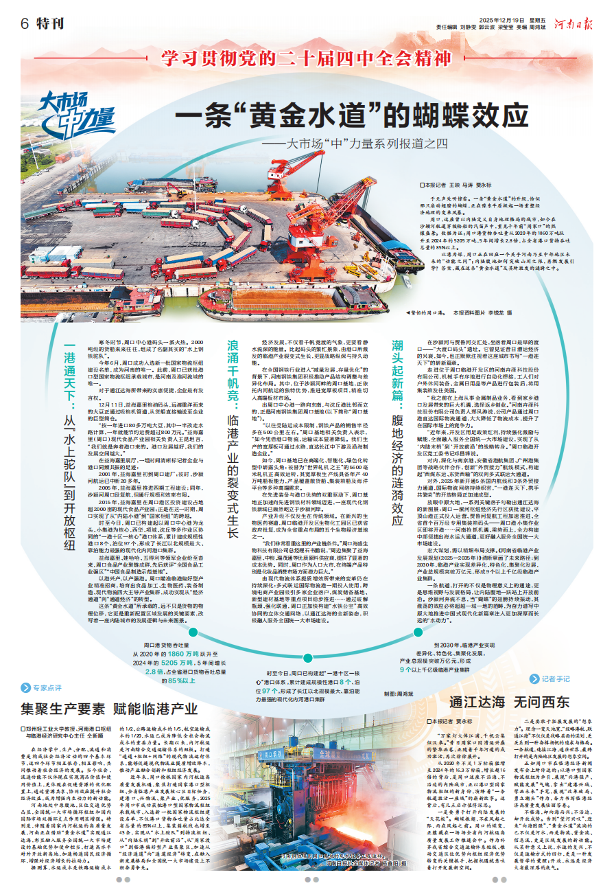 放眼中原大地,一系列關鍵落子勾勒出通江達海的新圖景:周口—漯河樞紐經濟先行區獲批建設、平頂山港正式投入運營、賈魯河復航工程加速推進、全省首個百萬級專用集裝箱碼頭——周口港小集作業區即將開港……河南搶抓機遇、乘勢而上,全力構建中部便捷出海水運大通道,更好融入服務全國統一大市場建設。
