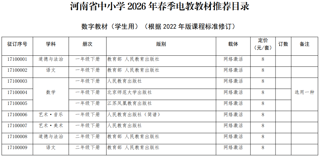 明年春季,河南省中小學(xué)教材新變化。近日,河南省教育廳發(fā)布河南省中小學(xué)2026年春季電教教材推薦目錄,含數(shù)字教材、教參及資源,2022年版課標(biāo)相關(guān)資源同步更新。要求免費(fèi)配發(fā)師生,做好技術(shù)保障與應(yīng)用指導(dǎo),由新華書店統(tǒng)一征訂,確保經(jīng)費(fèi)專款專用、與紙質(zhì)教材同步到校。
